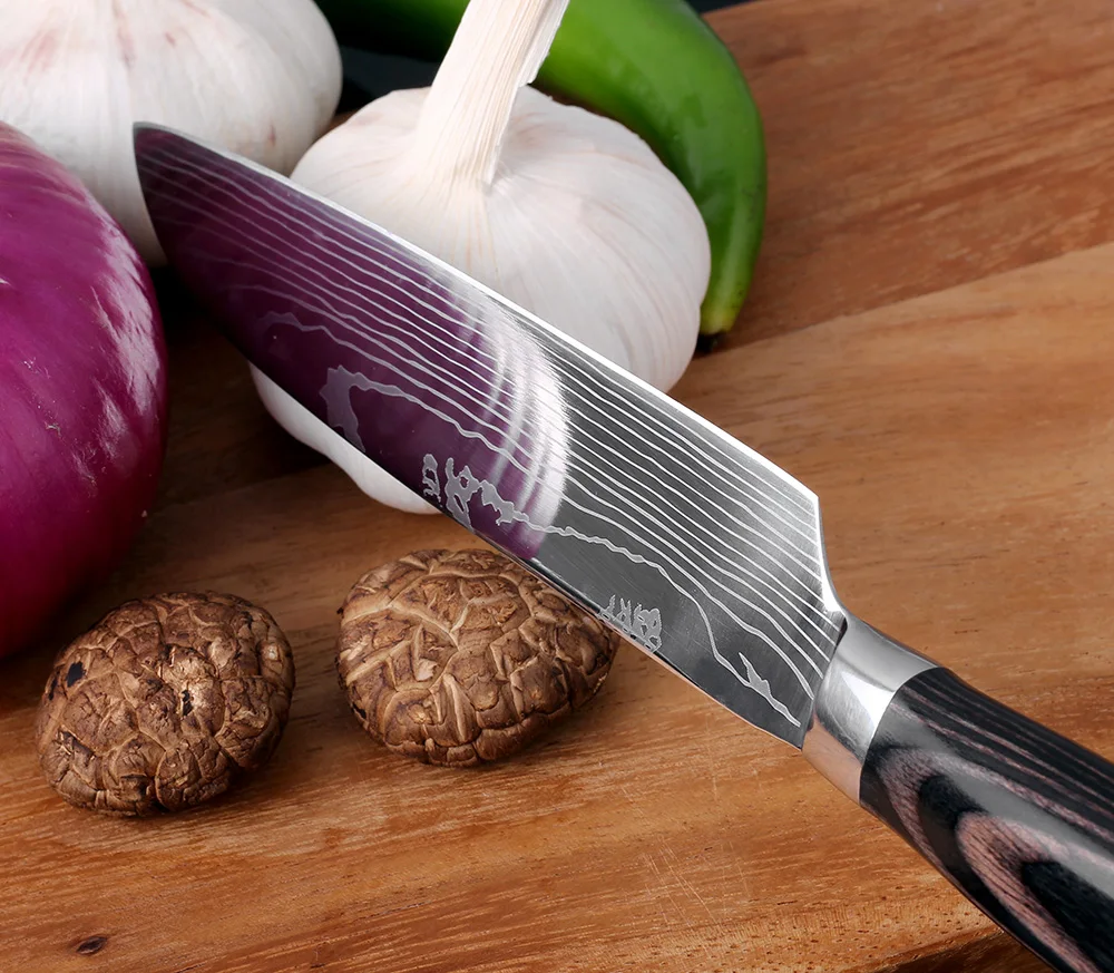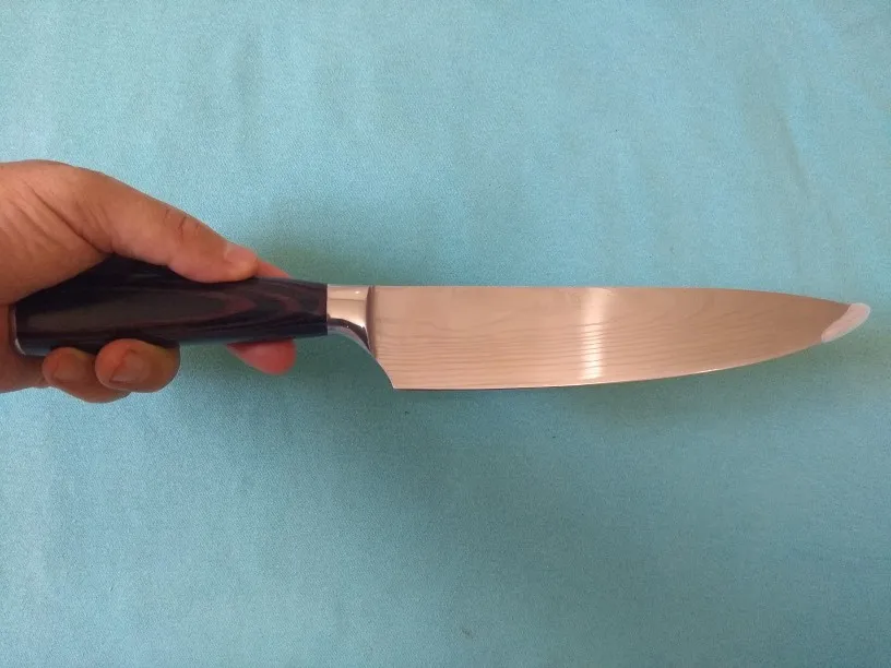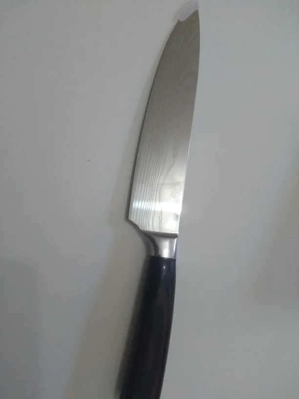 1. Материал лезвия-нержавеющая сталь 7cr17, светильник Поверхность лазерного Дамасского узора, такая красивая и высококлассная. Материал ручки-цветная древесина, перерабатываемый материал, экологически чистый.
