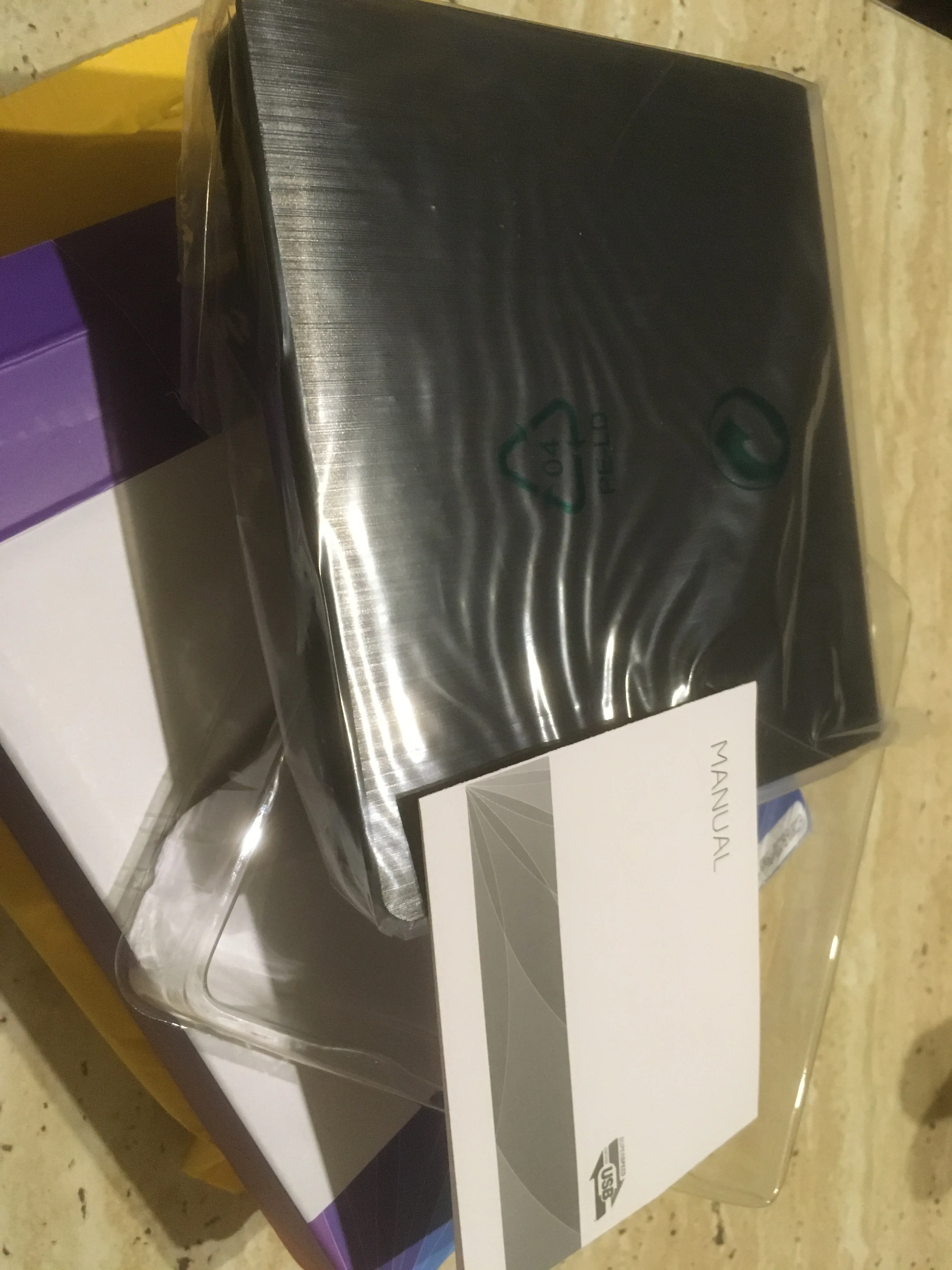 Товар пришел быстро, упакован хорошо. Выглядит качественно. Приятный на ощупь. Удобное крепление кабеля USB. Сам привод, внутри бокса, держится только за счет силы трения в разъеме, но держится крепко, не вываливается. Надо только установить декоративную планку на лоток и сунуть привод в бокс. Рекомендую.