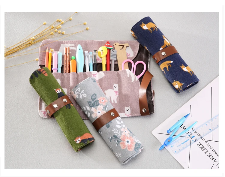 Пенал тканевый в рулоне с рисунком лисы енота альпаки, животных, цветов, органайзер для хранения канцелярских принадлежностей, школьные принадлежности