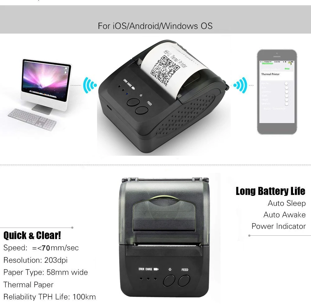 Термопринтер Zjiang беспроводной принтер Pos, 58 мм, Bluetooth, для Android, iOS, мобильный телефон, Windows