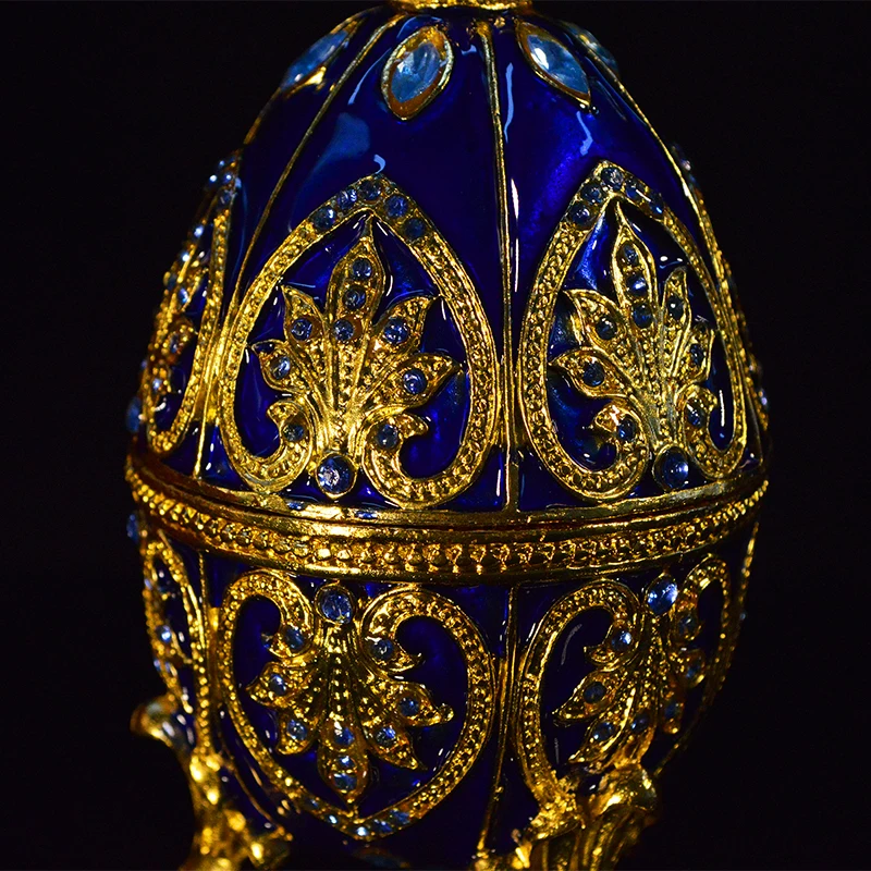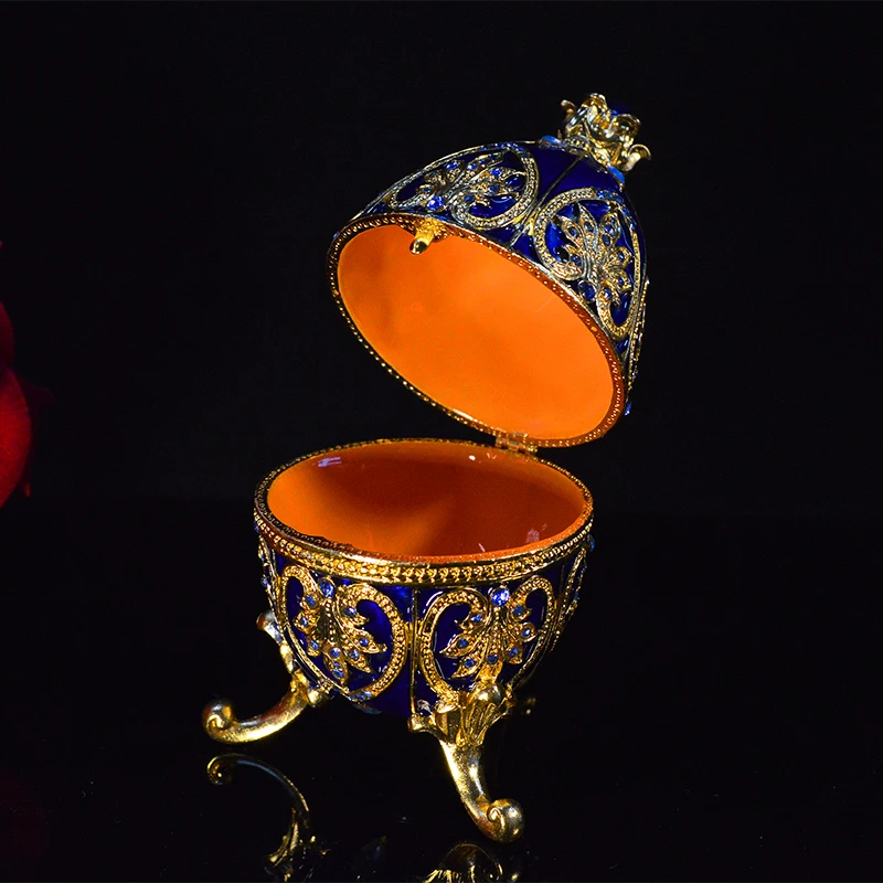 Дизайн изделия:Дизайн данного изделия вдохновлен российским яйцом Фаберже. Яйцо адаптировано с новым материалом под названием цинковый сплав, чтобы сделать его твердым и чистым, покрытым сапфировой синей глазурью также инкрустированным темно-синими драгоценными камнями. На поверхности 12 листьев в форме сердца со светло-голубыми самоцветами. Сделайте весь образ очень нежным, красивым, особенным.