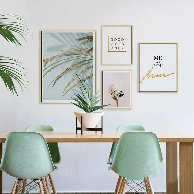 Современные розовые цветочные зеленые листья, надпись любовь, искусство на стену, картины для гостиной, кухни, домашний декор