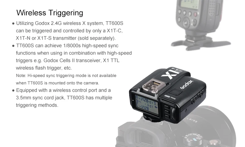 -Принимает Godox беспроводной x-системы, со встроенной 2,4G беспроводной передачи, может использоваться с Godox AD360II-C/AD360II-N, TT685C/TT685N, X1T-C/X1T-N беспроводной системы управления.-Встроенная беспроводная передача 2,4G с функциями «все в одном» и дальнейшей передачей 100 метров, чтобы предложить Вам стабильный выход и креативный светильник.-Улучшенная производительность: больше времени вспышки, approx.230 мигает полной мощностью (с использованием аккумуляторов Ni-MH 2500mA), обеспечивает достаточно времени вспышки для вашей съемки.-Более быстрое время рециркуляции: 0,1-2,6 s время рециркуляции при полной мощности (с использованием eneloop ni-mh батарей Panasonics).-Даже светильник освещения: GN60 (м ISO 100) Высокое Ведущее число фотовспышки, 1/300s - 1/20000s короткие длительностью вспышки, 5600 ± 200K стабильной цветовой температурой.-ЖК-панель большого размера обеспечивает четкую и удобную работу.-При использовании с беспроводным триггером вспышки X1 TTL (продается отдельно), может удаленно запускать вспышку TT600 и управлять ручным выходом, предлагая лучший пользовательский опыт.-Высокоскоростная синхронизация (HSS): может осуществлять высокоскоростную синхронизацию при использовании с триггером Godox Cell-II или беспроводным триггером X1C/X1N TTL (продается отдельно), максимальная скорость может достигать 1/8000s (зависит от камер). Особенно удобно при использовании диафрагмы для заполнения вспышки на портрете. Обратите внимание: TT600 не может реализовать HSS при использовании на камере горячий башмак.-Поддержка режимов M /S1/ S2, автоматическое/Ручное Масштабирование 20-200 м.-С настраиваемыми настройками функций C.Fn.-С функцией автоматической защиты от перегрева вспышки.