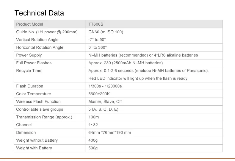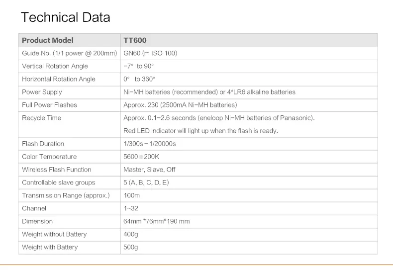 Модель продукта: TT600/TT600SРуководство № (1/1 выход @ 200 мм): GN60 (m ISO100)Вертикальный угол поворота: -7 °-90 °Угол горизонтального поворота: 0-360 °Источник питания: Ni-MH батареи (рекомендуется) или 4 * LR6 щелочные батареиПолная мощность вспышки: approx.230 раз (2500mA Ni-MH батареи)Время рециркуляции:Прибл. 0,1-2,6 секунды (eneloop ni-mh аккумуляторы Panasonic)Красный светодиодный индикатор будет светильник, когда вспышка готово.Продолжительность вспышки: 1/300s-1/20000sЦветовая температура: 5600 ± 200KФункция беспроводной вспышки: Master, Slave, OffУправляемая подчиненная Группа: 5(A,B, C, D, E)Диапазон передачи (прибл.) 100 мКанал: 1 ~ 32Размеры: 64*76*190 ммВес без аккумулятора: 400 г