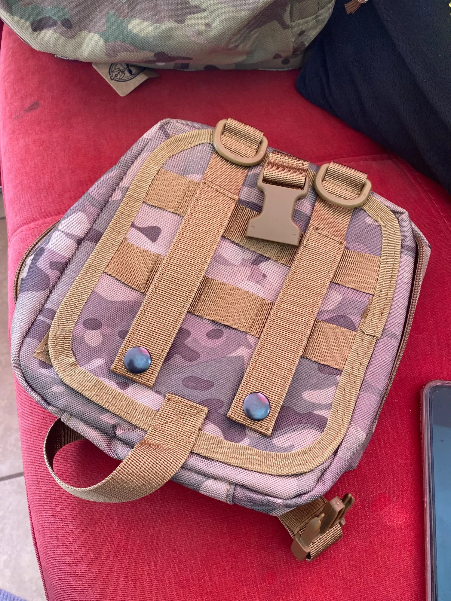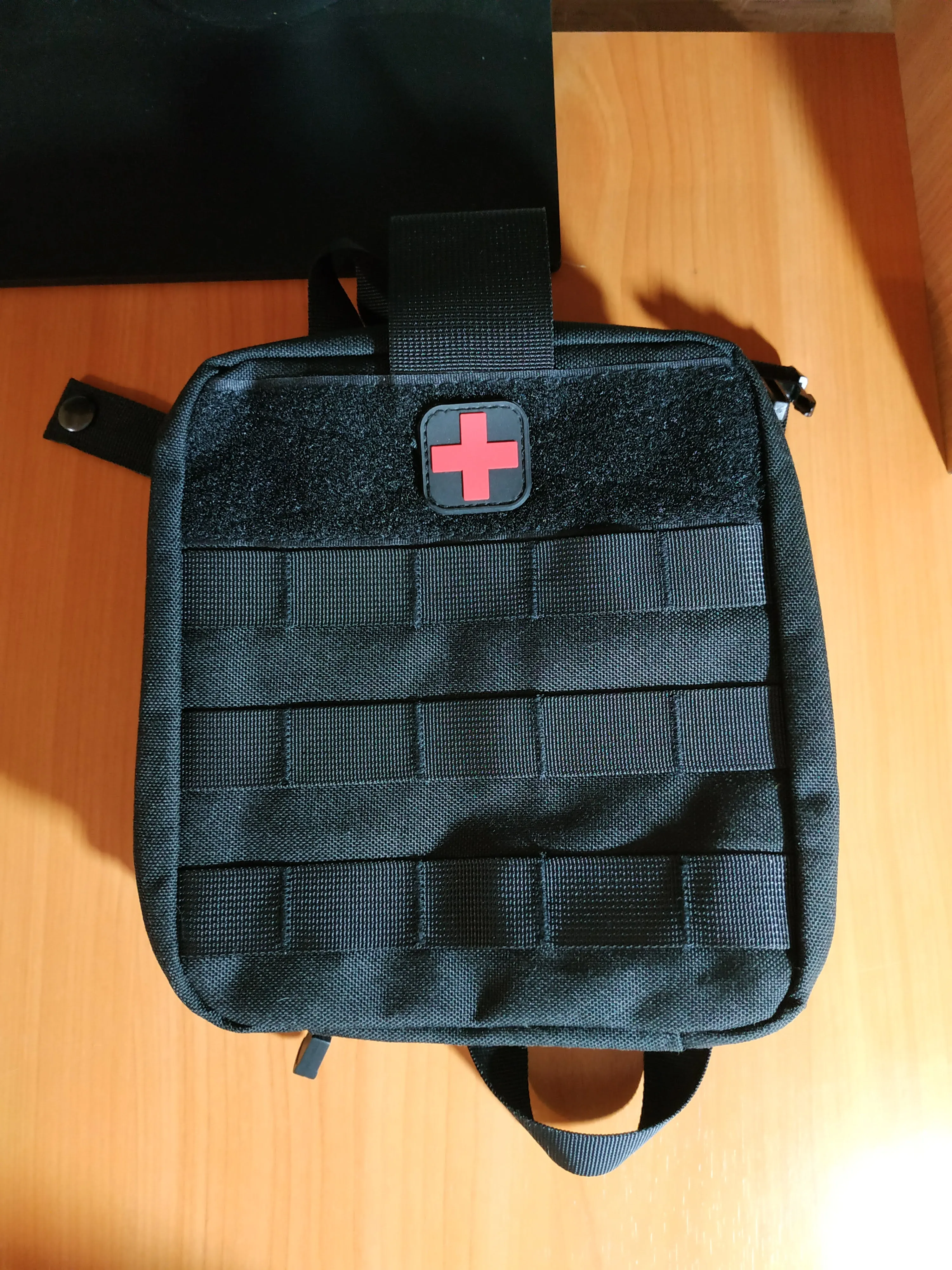 Сумка очень качественная. всем рекомендую. Сзади есть липучка на всю поверхность, так что много вариантов крепления, не только ремешки моле. Внутри кармашки и вставки. Все будет отсортировано. Красный крест на липучке, при желании можно снять.