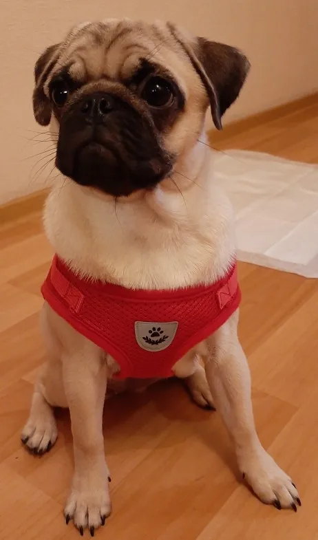На мопса,четыре месяца, великоват, но на вырост самое то.