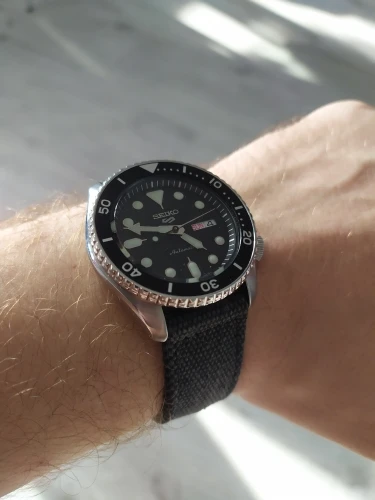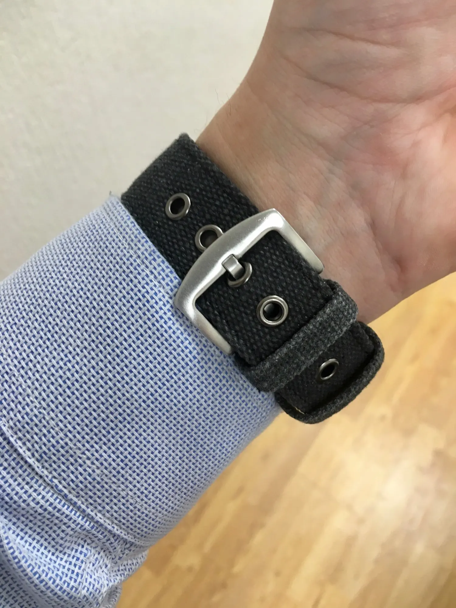 Ремешок плотный, приятный на ощупь. На запястье в 7" застёгивается на 4-5 из 6. За свои деньги качество отличное. Сам ремешок скорее для комфорта и долгой службы, чем для красоты. Как и большинство "джинсовых" ремешков.