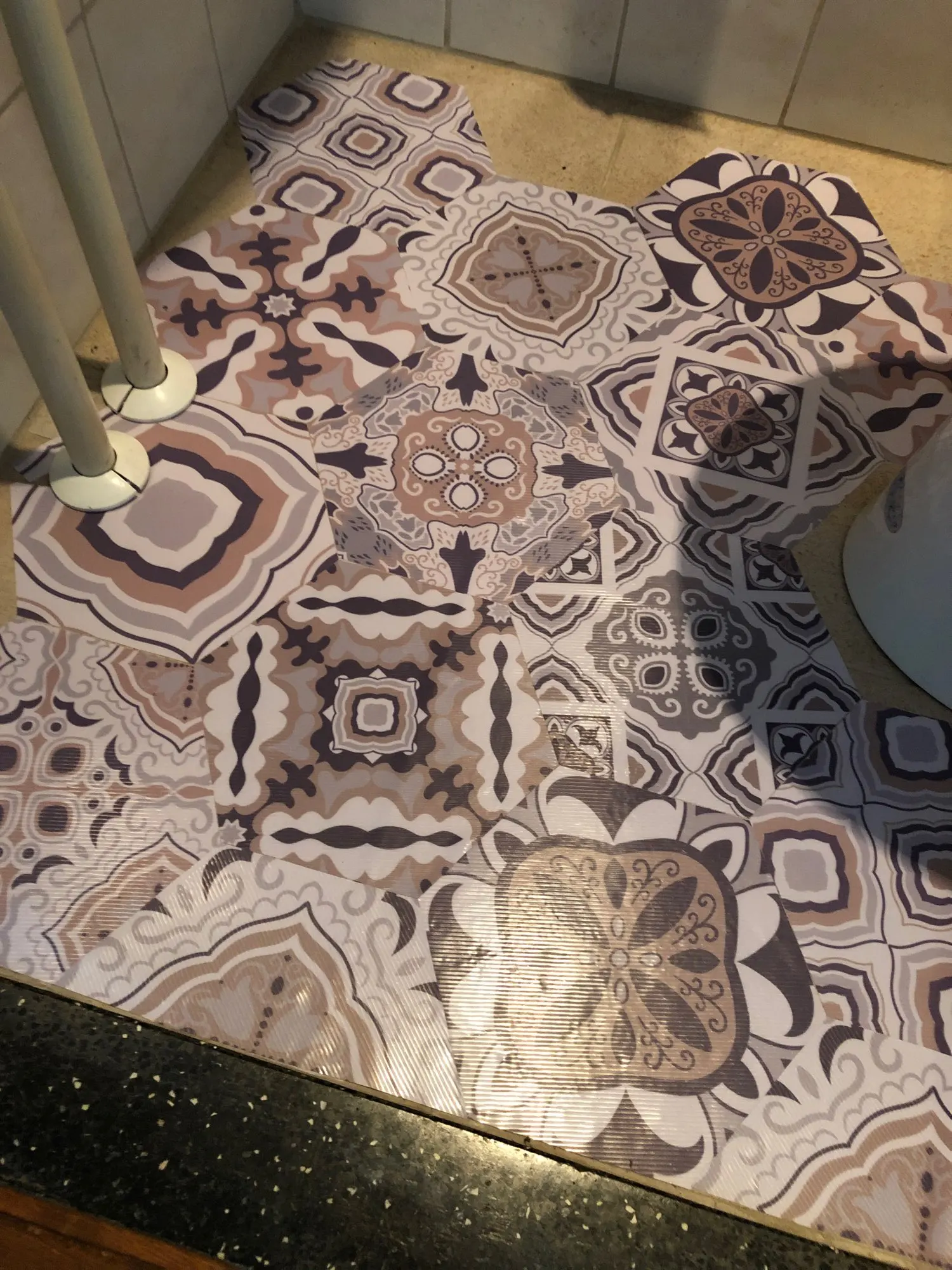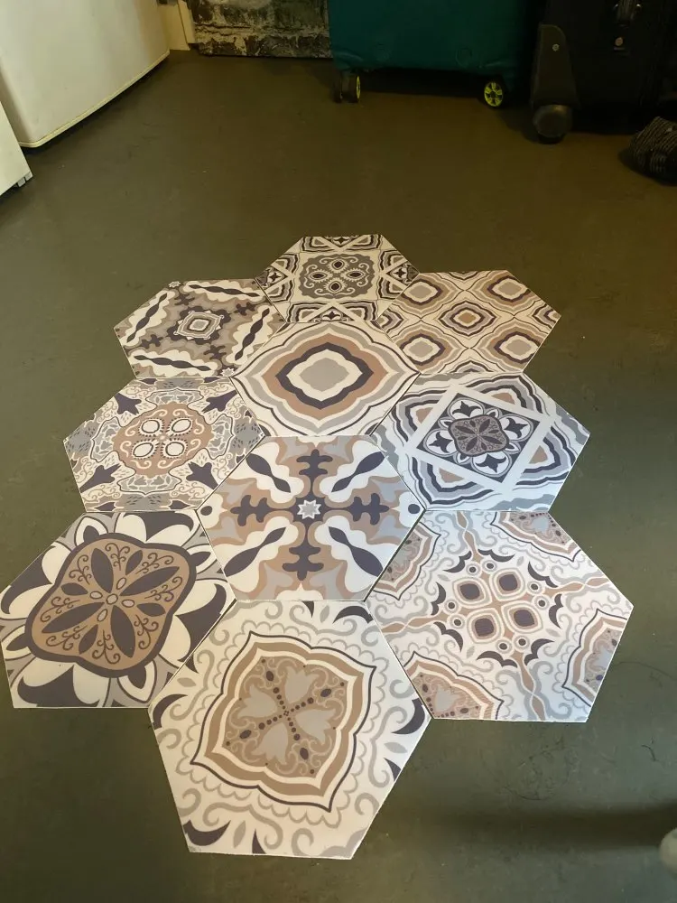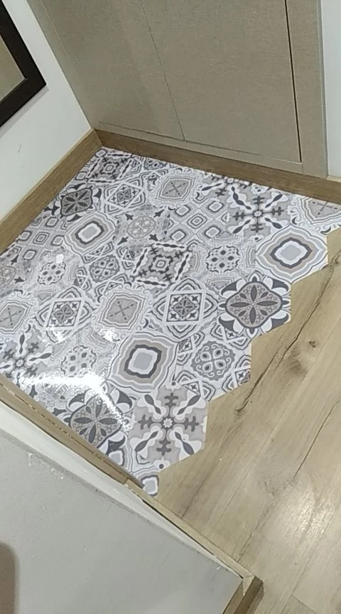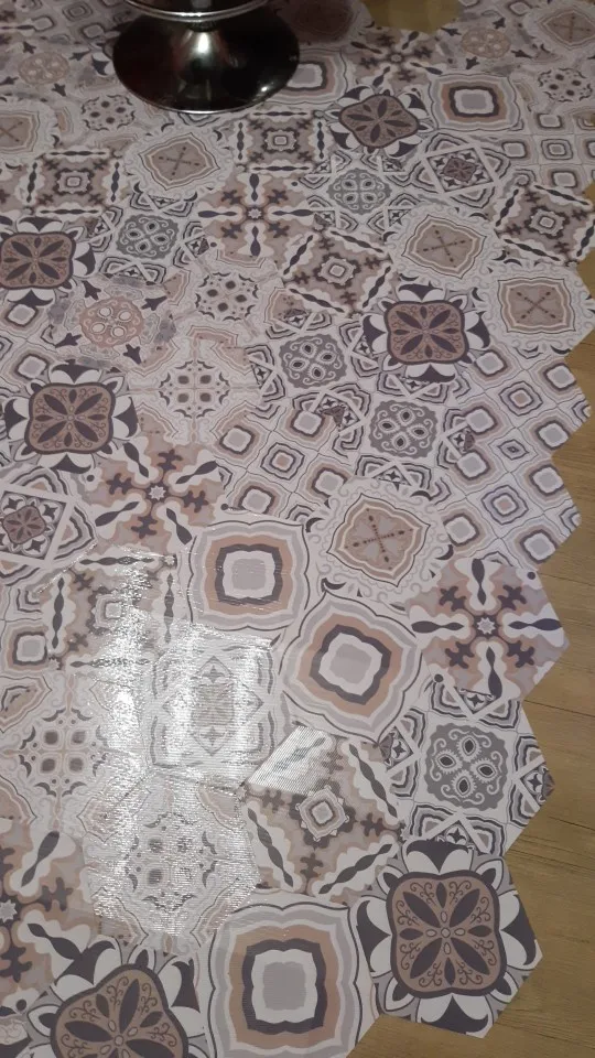 Я наложил их прямо над плиткой, и они красиво опустились. Легко выстраивать, нет проблем с цветом и легко резать. Я сделал это менее, чем за один день. На моем полу есть неровное пятно, и две плитки должны быть приклеены, так как клей не был достаточно сильным. Надеюсь, они будут выглядеть очень хорошо.