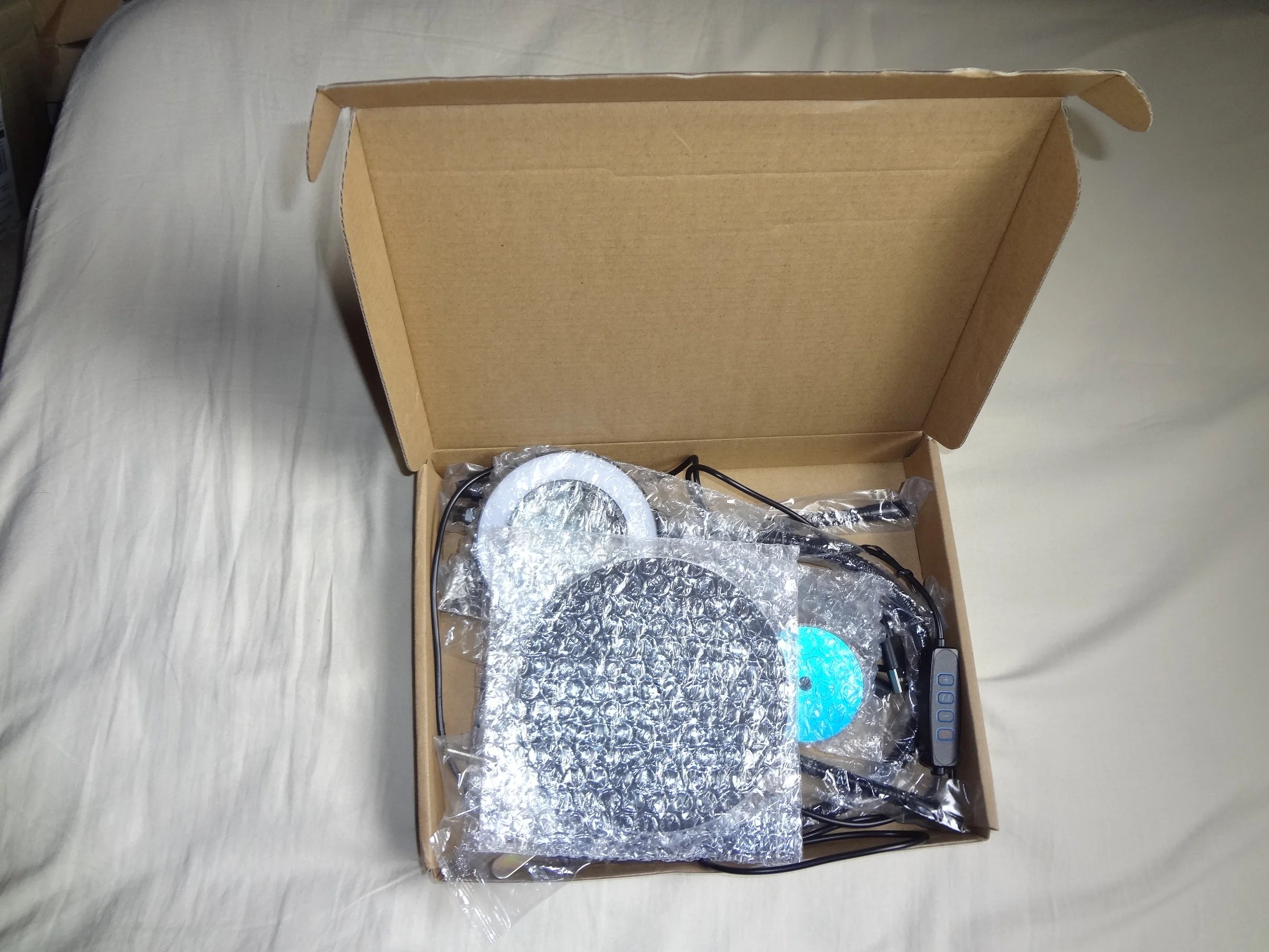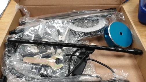 Item came as described, box had some small corner dents, (probably due to shipping), however, there was no visible damage to items in box. Have yet to assemble the set but have tested the light. Light was adjustable and colour changeable, can be mild and very bright. The metal base is solid and feels well machined and finished, should be useful in keeping the set stable when in use.
