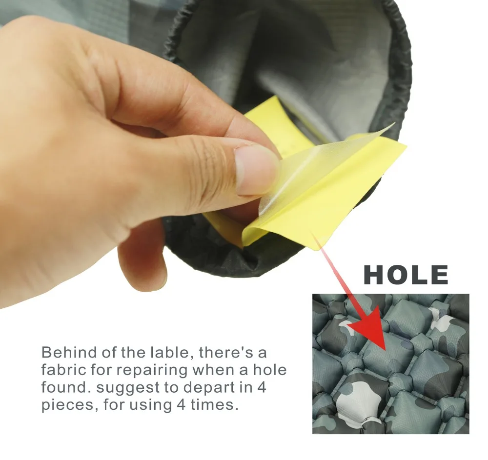 Мы предоставляем бесплатный патч. Если спальный коврик случайно коснется острых предметов и протекает, вы можете использовать его, чтобы исправить это.