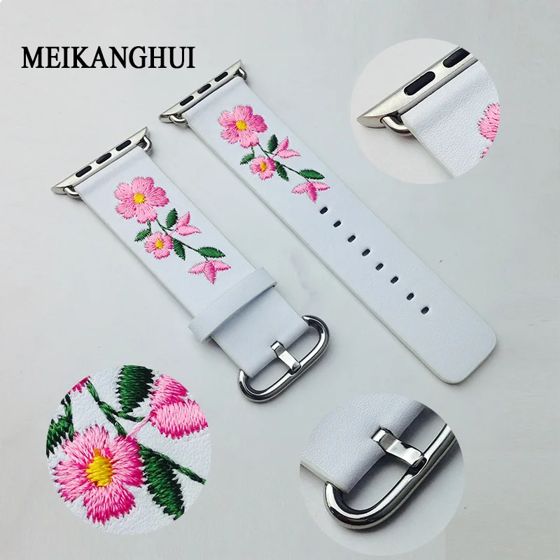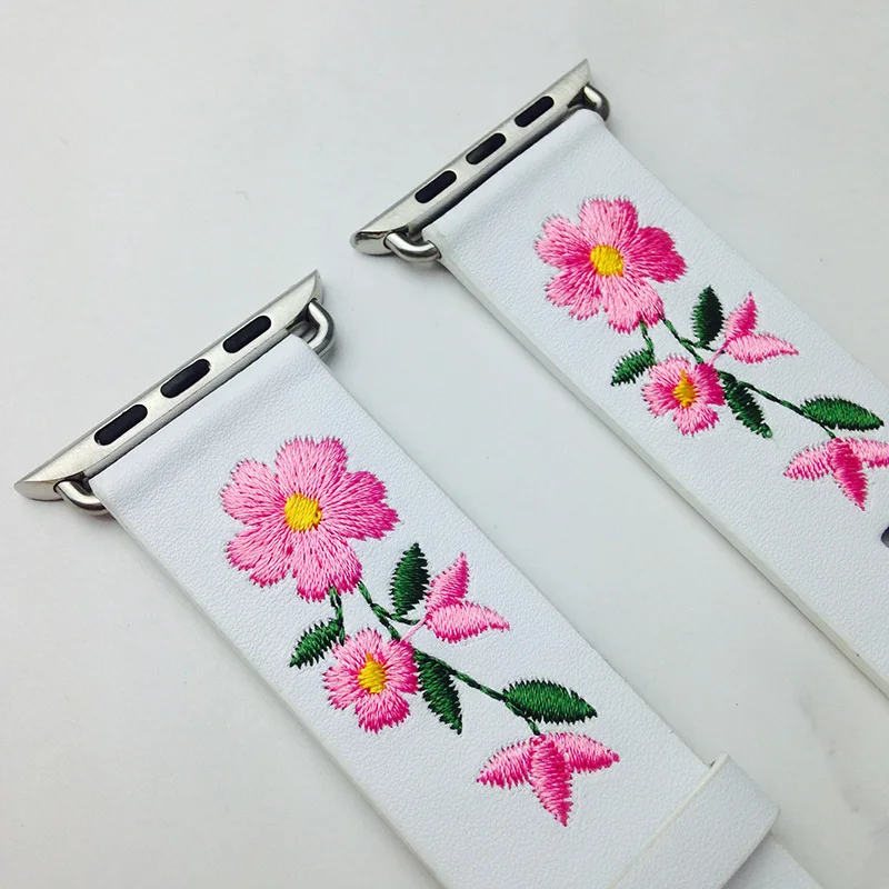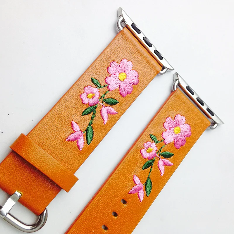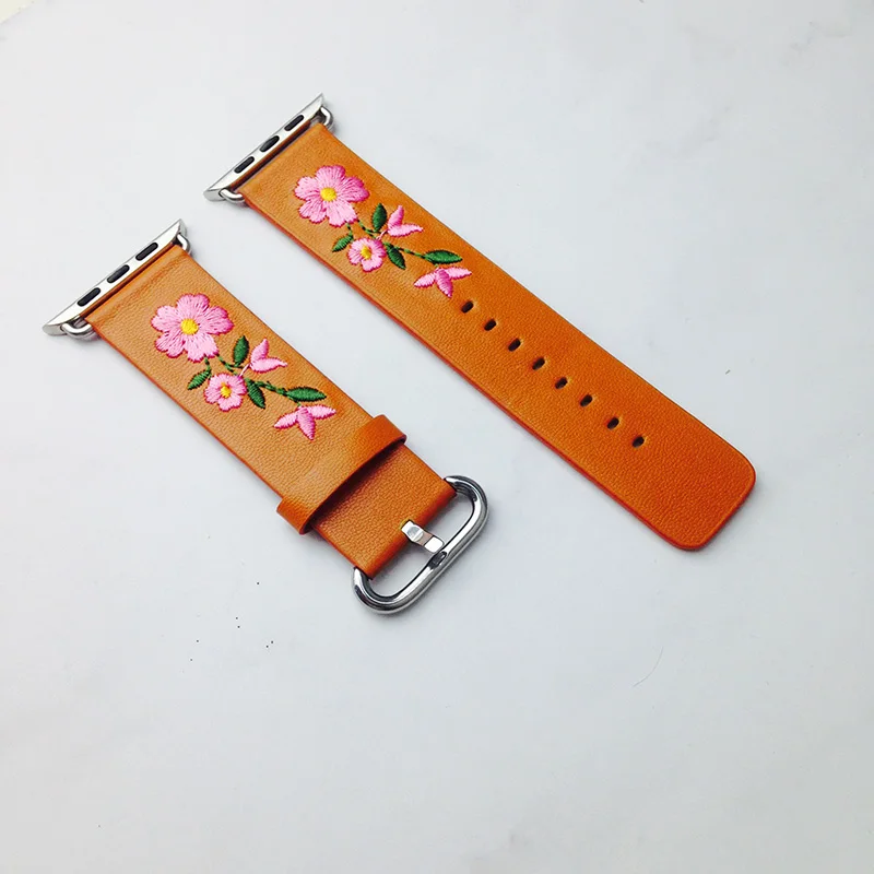 Ремешок из натуральной кожи для Apple Watch 38 мм 42 мм, сменный Браслет с красной цветочной вышивкой для iwatch 1 2 3