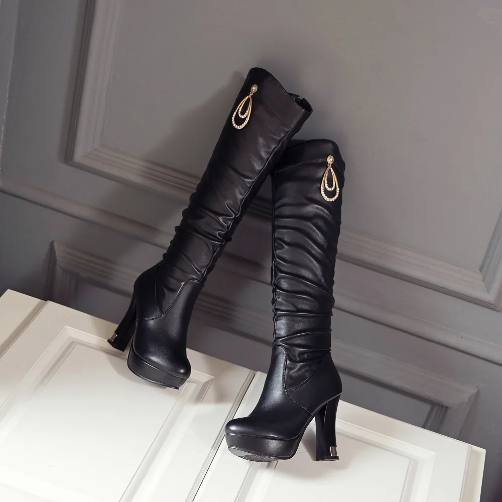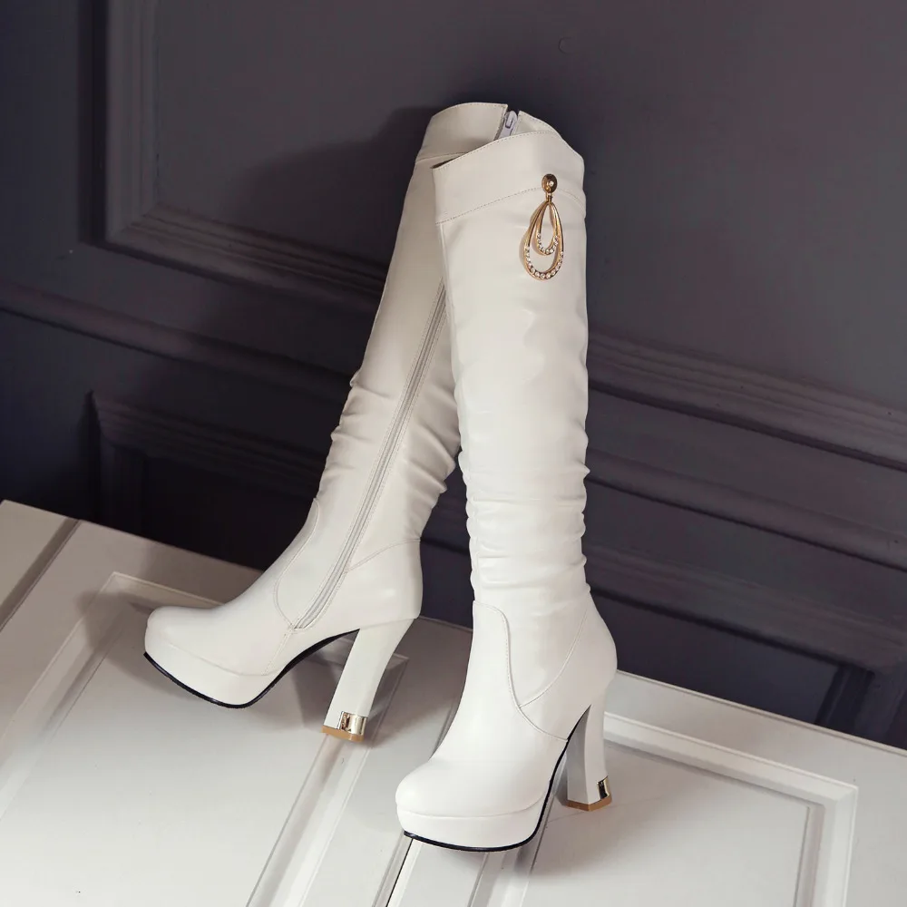 Женские сапоги выше колена, черные, белые, розовые сапоги с круглым носком, на Высоком толстом каблуке, вечерняя Классическая обувь, большие размеры до 43