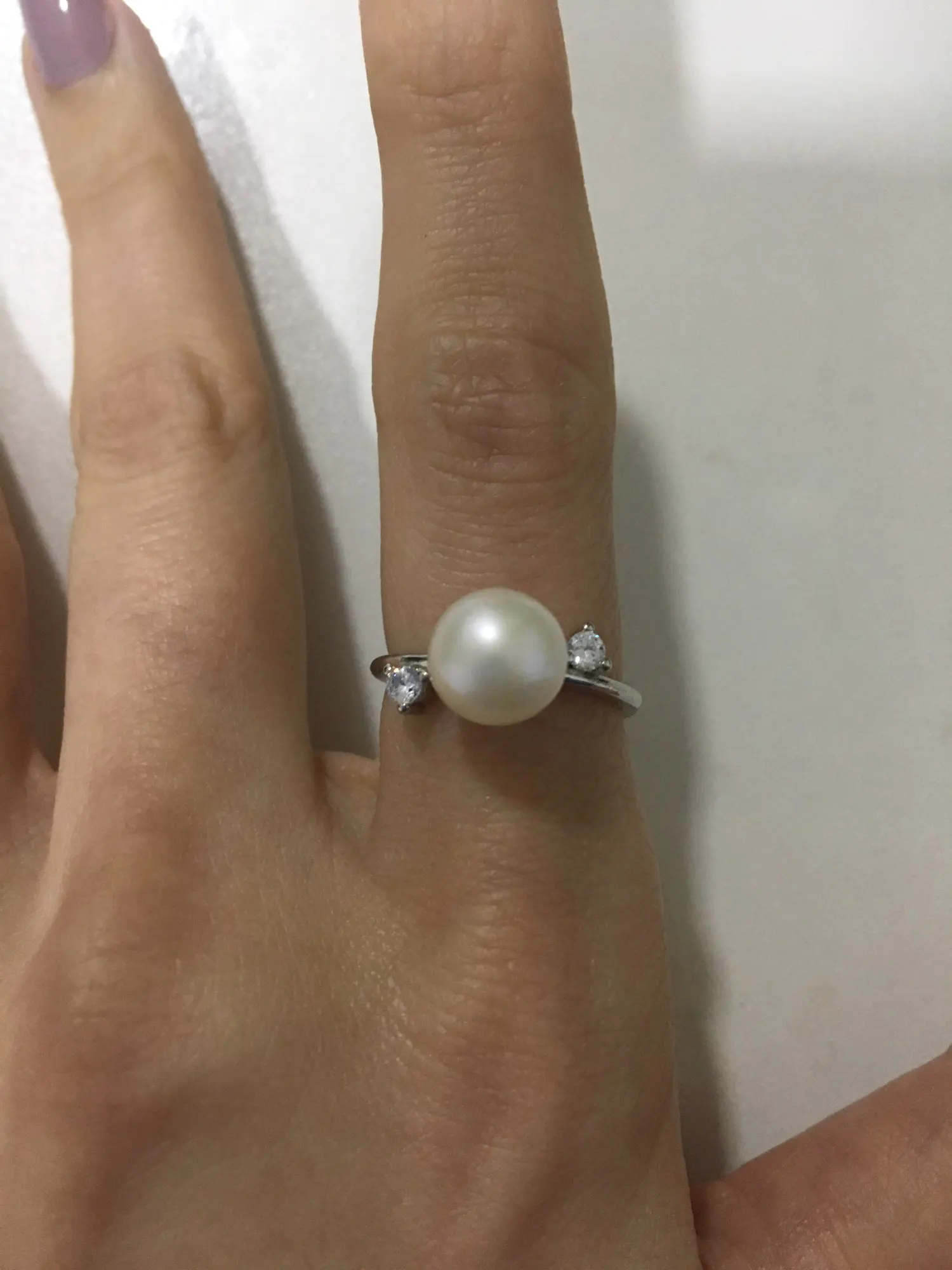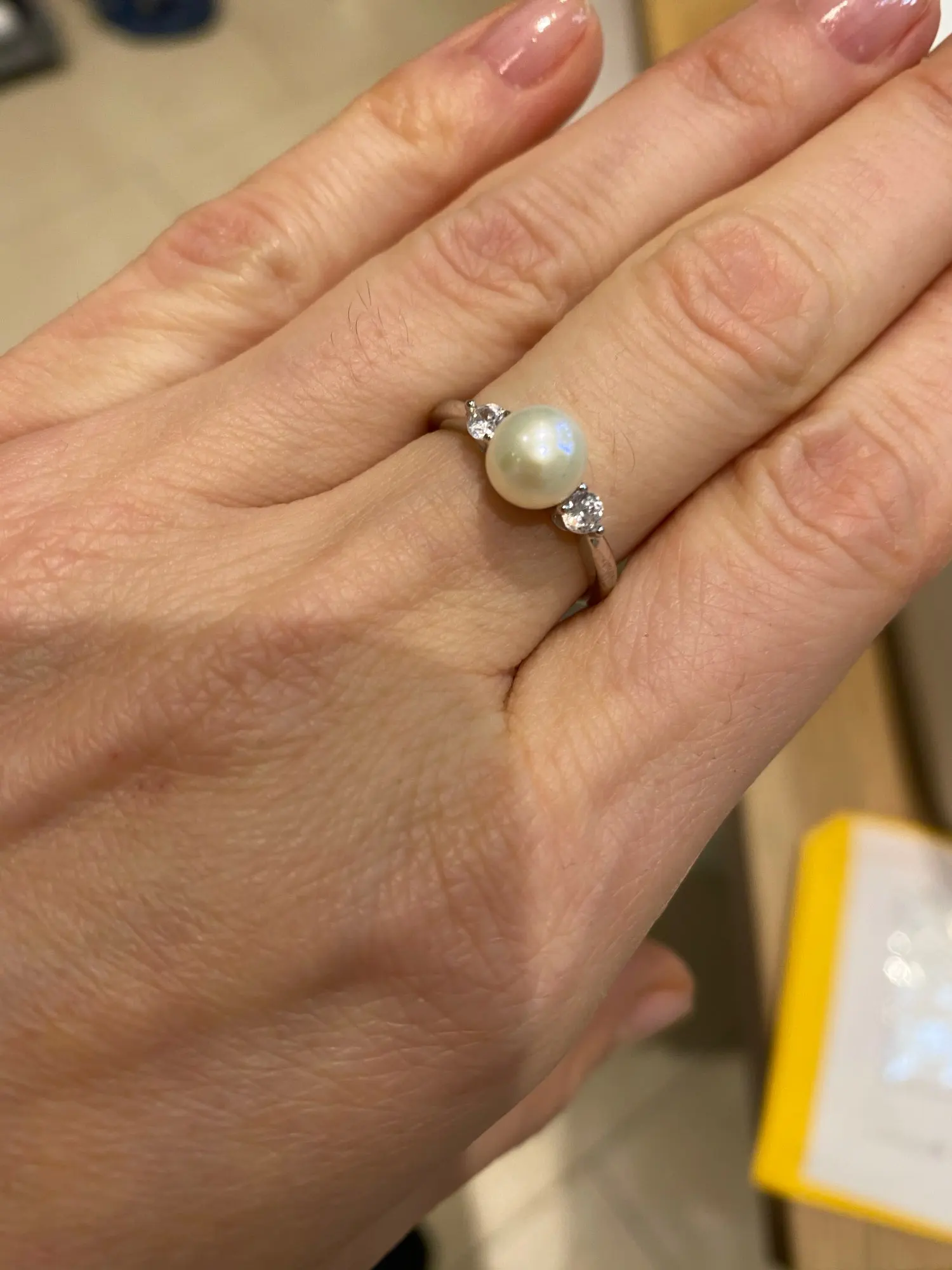 Колечко немного отличается от фото. Камешки расположены наискосок от жемчужины. Пришло отлично упаковано, в красивой коробочке. Продавец положил в подарок специальную салфетку для ухода за колечко, спасибо! С удовольствием ношу, нежное, без излишеств.
