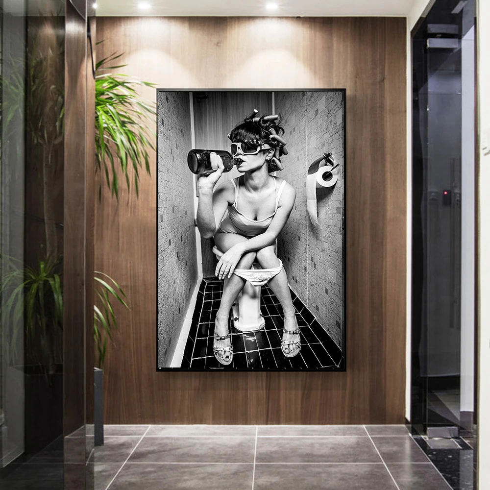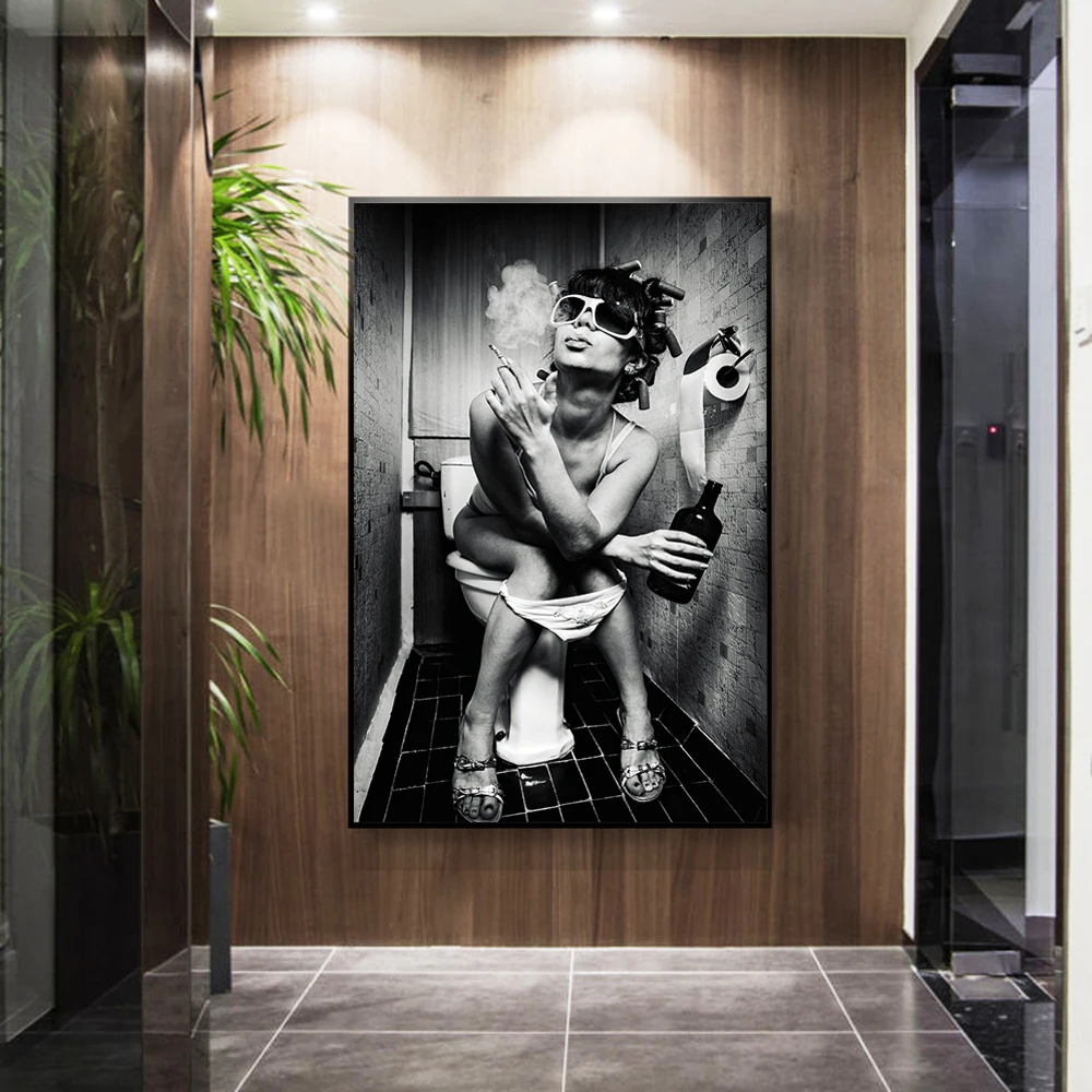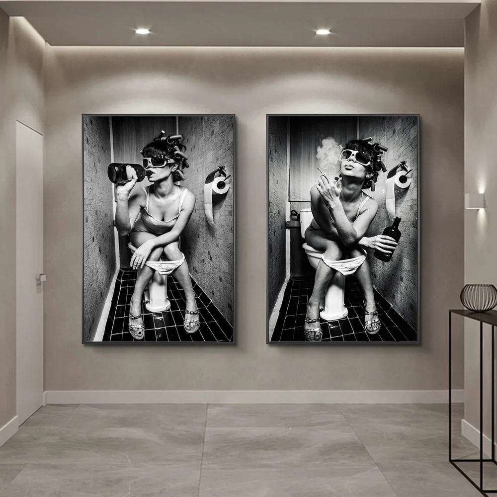 Сексуальная девушка сидеть в туалете нордический холст художественные плакаты и принты черно-белая женщина курить и пить в туалете картина плакат