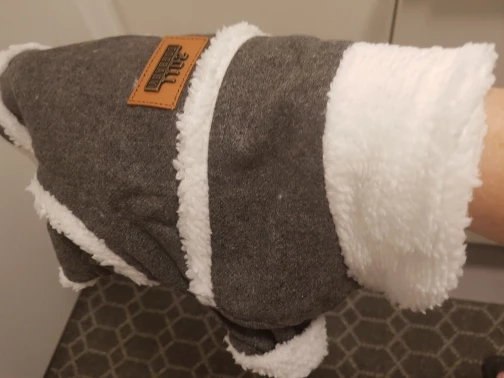 чуть тоньше, чем кажется, но теплая. качество хорошее, без запаха. с XL на йорка 4кг - это мы погорячились :) зато есть запас для кофточки. собачка чувствует себя в ней отлично. надо будет только убрать "хвост" у этого кожуха и будет в самый раз. доставка быстрая. спасибо.
