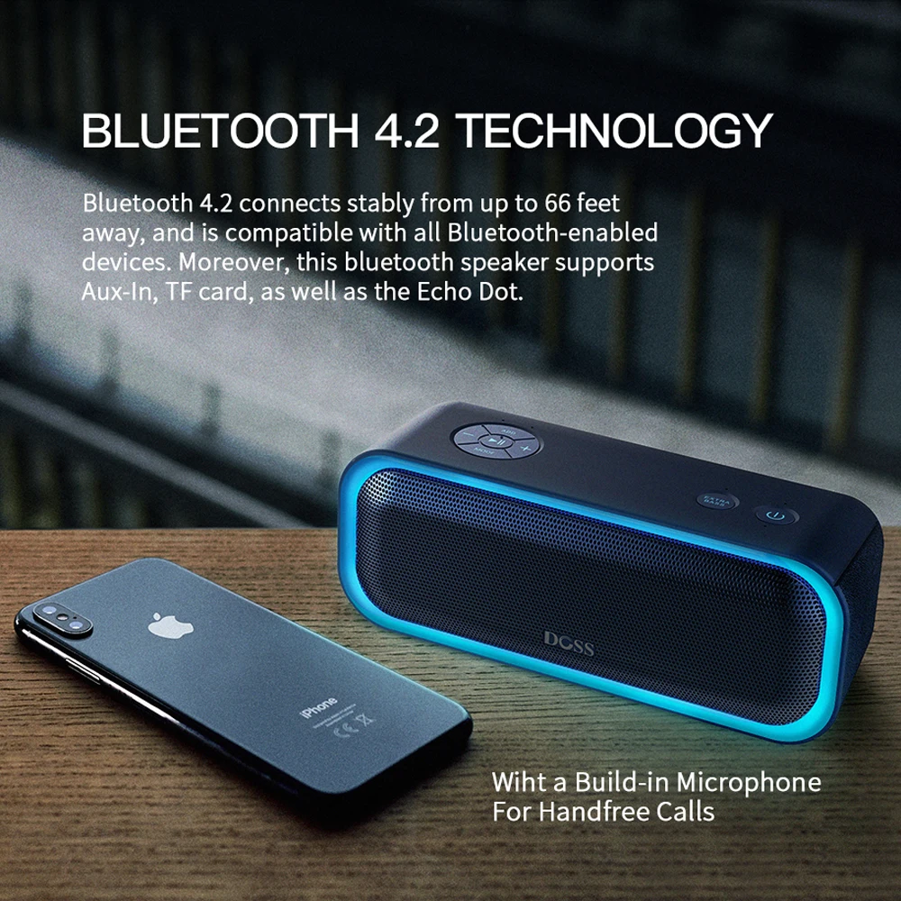 Как в описании. Звуковая колонка с отличными басами и красивым корпусом. Мне нравится его качество, особенно по сравнению с ценой. Благодаря DOSS. Срок службы батареи очень хорош для более чем 8 часов среднего объема. Потрясающий звук с басами и световыми эффектами.