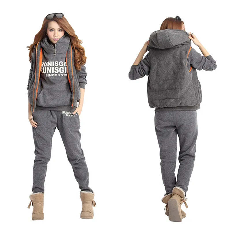 Костюм спортивный женский флисовый, комплект из 3 предметов, толстовка + жилет + брюки, с надписью, для бега, Осень-зима