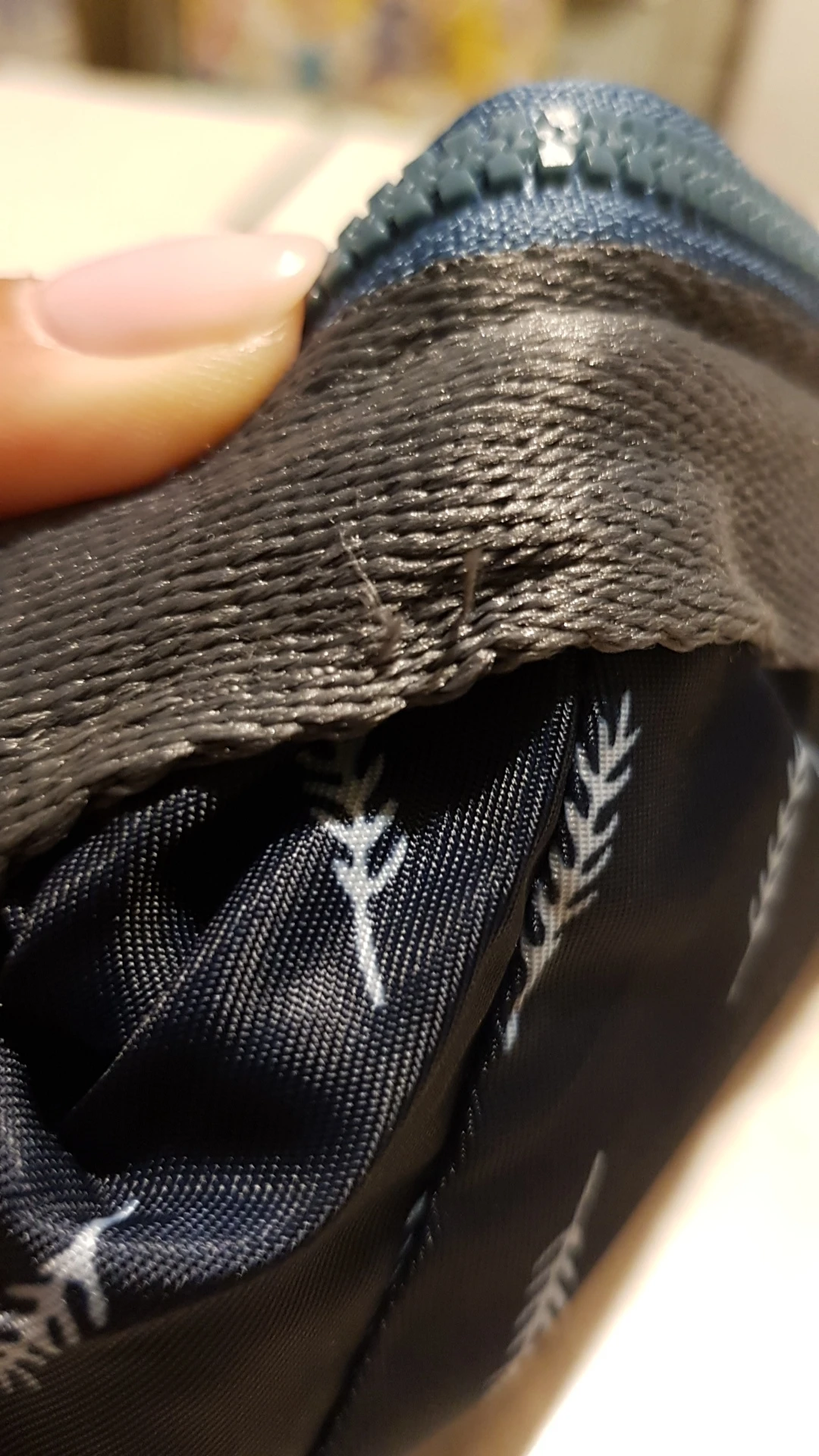 Сверху под молнией есть жесткие проволочены, т. е. её не сложить в маленький квадрат. Молния пристрочена криво.