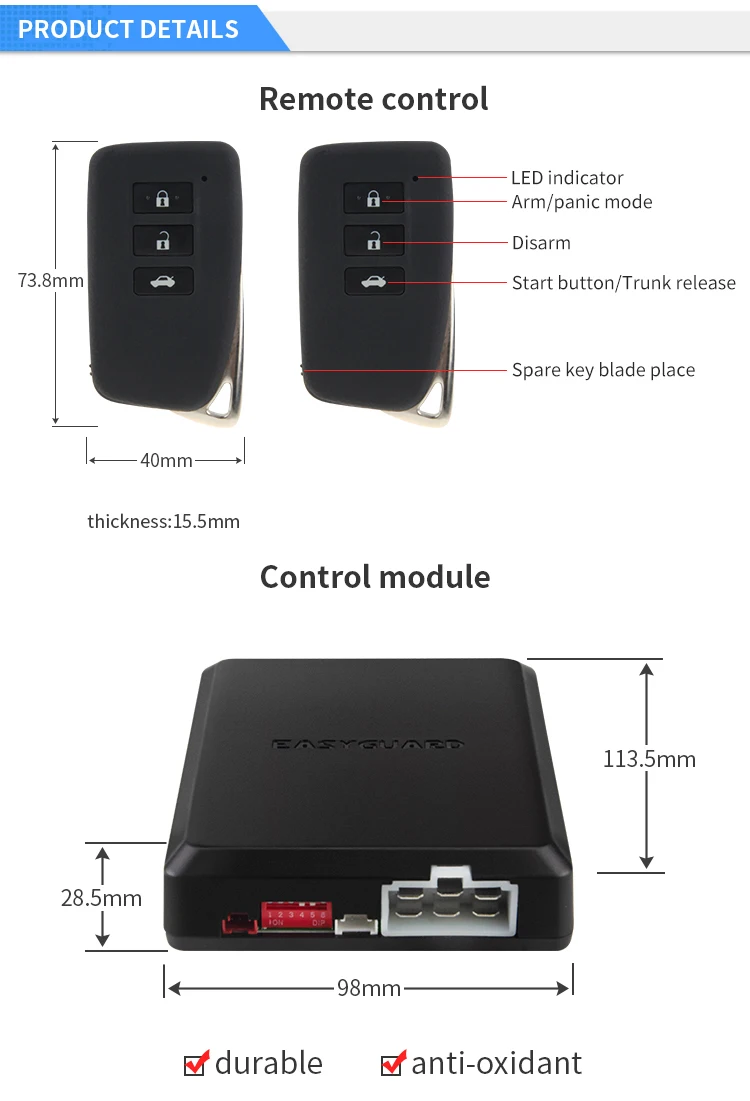 Это ec002-le-ns PKE сигнализация от EASYGUARD с пуском двигателя, дистанционным запуском двигателя и функцией предупреждения датчика удара.