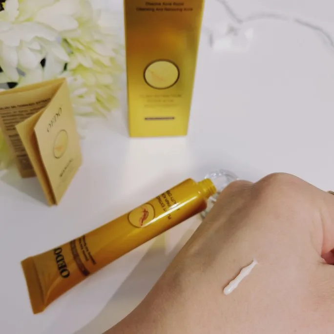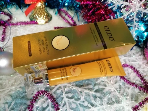 Крем был красиво упакован в фирменную, золотую коробочку. Коробка была заклеена стикером, доказывающим, что коробка не вскрывалась. Тюбик на 20 г. Шарм тюбика в его крышке. А плюс крышке, что с помощью нее он может стоять вертикально. Открутив крышку сразу бросается в глаза удобный носик тюбика. Таким носиком удобно наносить крем точечно и в маленьких количествах. Сам крем светло - коричневый. Запах травяной, напоминает лекарство, ели уловимый. Я считаю, что запах натуральный, а значит в составе мало химии или нет вообще. По консистенции крем густой, хорошо впитывается и даже если попробовать на раку уже чувствуется, что он хорошо питает кожу. Крем удаляет акне, сужает поры, отбеливает и питает кожу. Способ применения : Умыться и нанести на проблемные места небольшое количество крема. Втирать до полного впитывания. Первое впечатление положительное, буду пользоваться дальше и смотреть на результат.