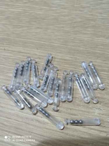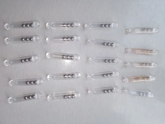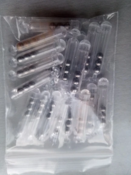 Tube plastique avec 3 billes. Ça fait du bruit. Moins que les tubes en verre. Mais ne cassent pas.