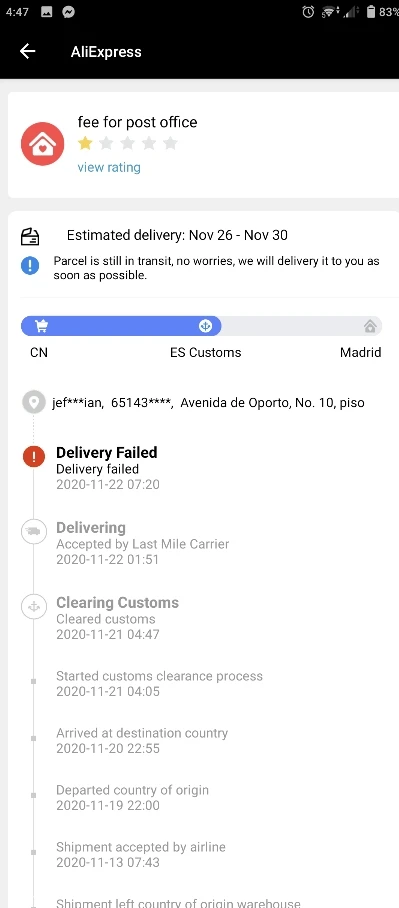 Возможно, это афера, потому что Примечание уже закончено, даже я не получил свой заказ. Я открываю спор, потому что прошло месяц с тех пор, как я оплатил этот заказ, и при отслеживании моего заказа, кажется, что доставка не прошла, но никто не стучит в мою дверь или звонит в мой дверной звонок, и невозможно, что они доставят в тот день потому что это воскресенье. Aliexpress также должен защитить покупателя не только своего продавца. Неверно закрывать бизнес, если покупатель не получил свой заказ.