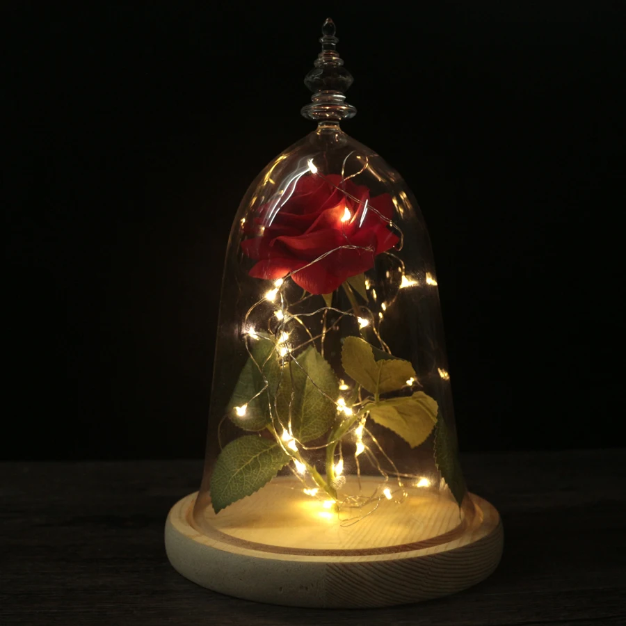 Красная роза в стеклянном куполе Красавица и чудовище, деревянная основа со светодиодной подсветкой, День святого Валентина для девушки, подруги, подарок, украшение для дома