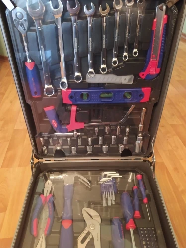 хороший набор. конечно слегка пафосный в смысле чемодана на колесиках и тп, но хороший. сам чемодан кстати неплохой, хотя и со своими недостатками типа заклинивающей ручки при попытке ее удлинить. но для перевозки инструментов норм. в чемодане две вынимающихся пластиковых укладки с инструментами. укладки с обратной стороны имеют отверстия для подвеса на стену. сами инструменты стандартные для воркпро, довольно хорошего качества. в целом вещь достойная.