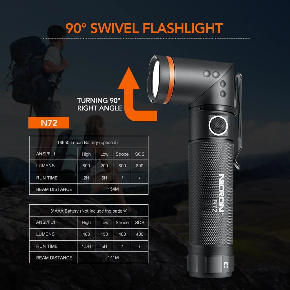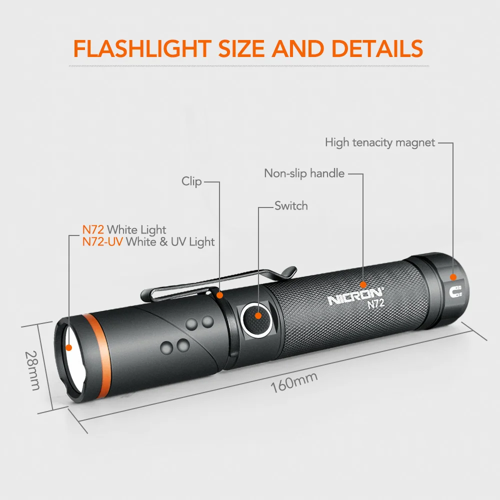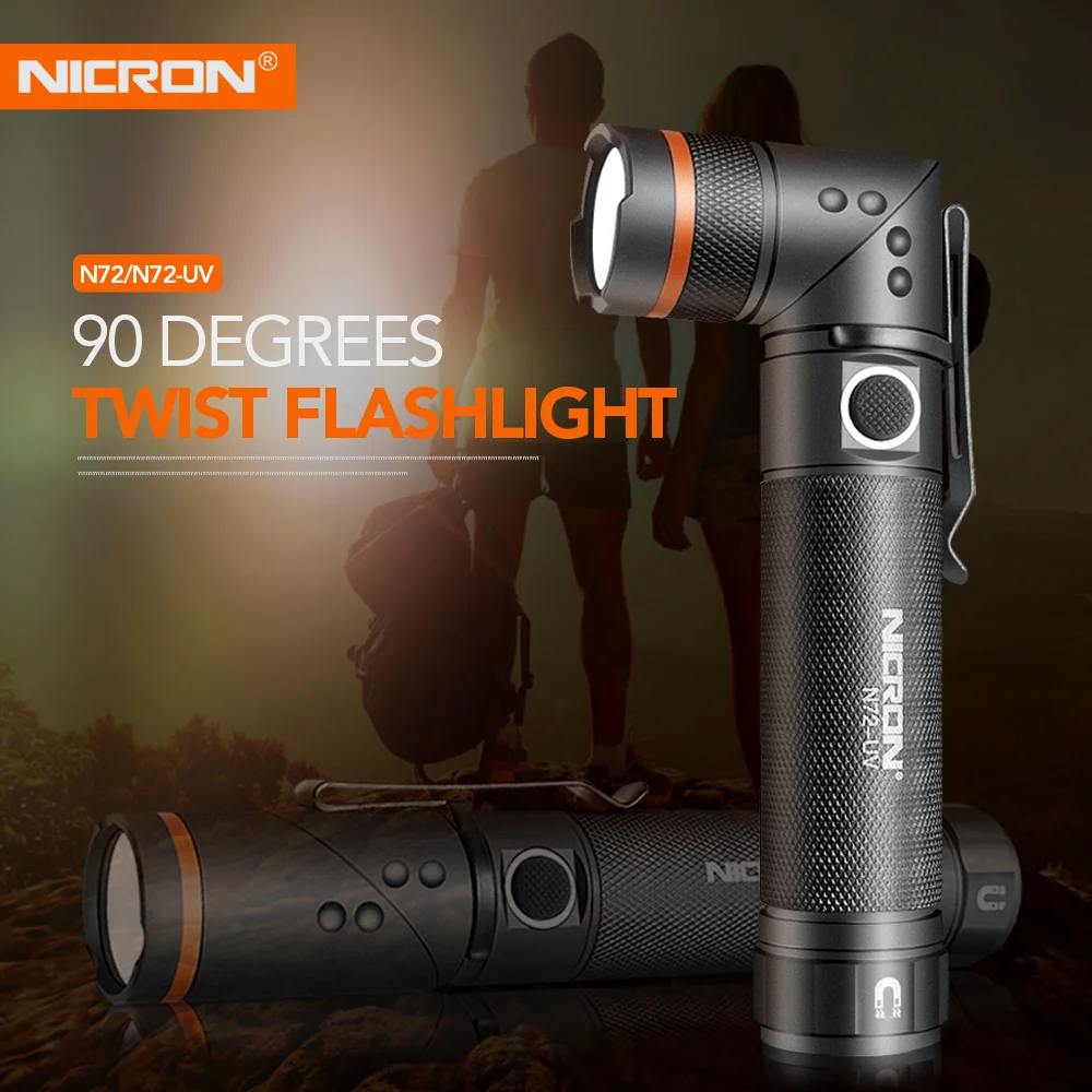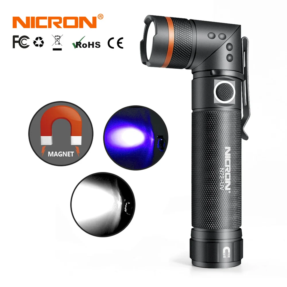 Светодиодный фонарик NICRON N72N72-UV, поворот на 90 градусов, водонепроницаемость IPX4, 800 люмен, БелыйУФ светильник, магнисветильник фонарь