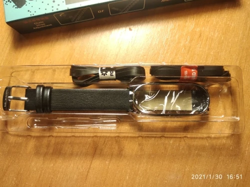 Ремешок симпатичный, но кожзам выглядит дёшево. В комплекте идут 4 резиновые проставки под разные виды браслетов Mi Band3, Band4, Band5. Попробовал вставить капсулу браслета (снизу вверх) держится надёжно. Пока пользуюсь другим силиконовым ремешком, а этот пусть лежит как запасной.