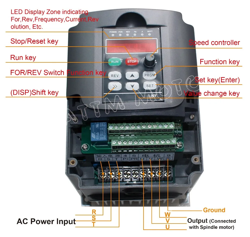 1) моторизованный шпиндель со средней частотой питания номинальное напряжение, частота должна соответствовать параметрам технологии электрического шпинделя, скорость вращения моторизованного шпинделя может изменить частоту для регулировки, а также прямое пропорциональное изменение напряжения.
