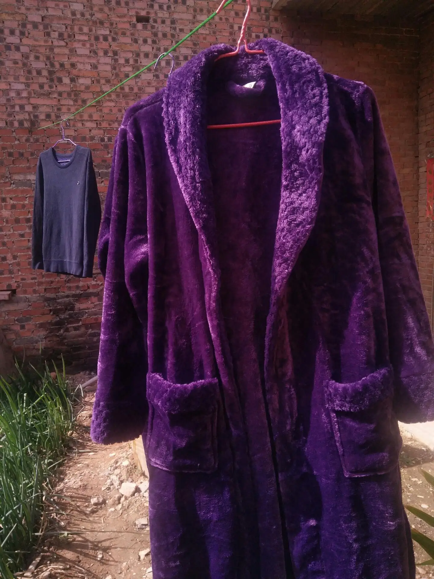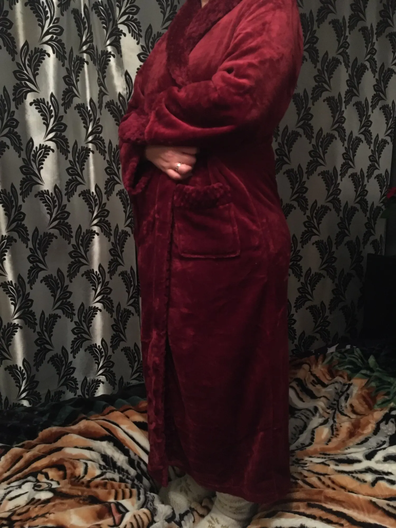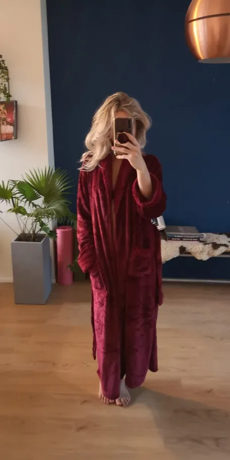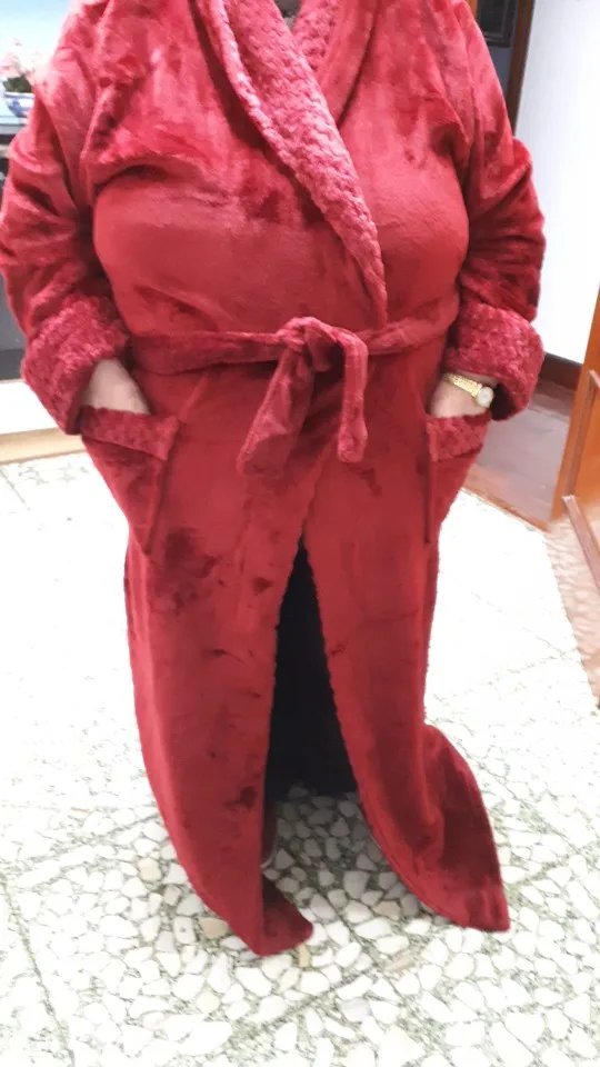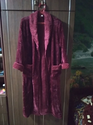Халат мягкий и хороший, однако, цвет более фиолетовый, чем винно-красный. Он также не выглядит так долго, как на картинке. Он покрывает только колени. Слишком короткий для мужчин, но мне все еще нравится халат.