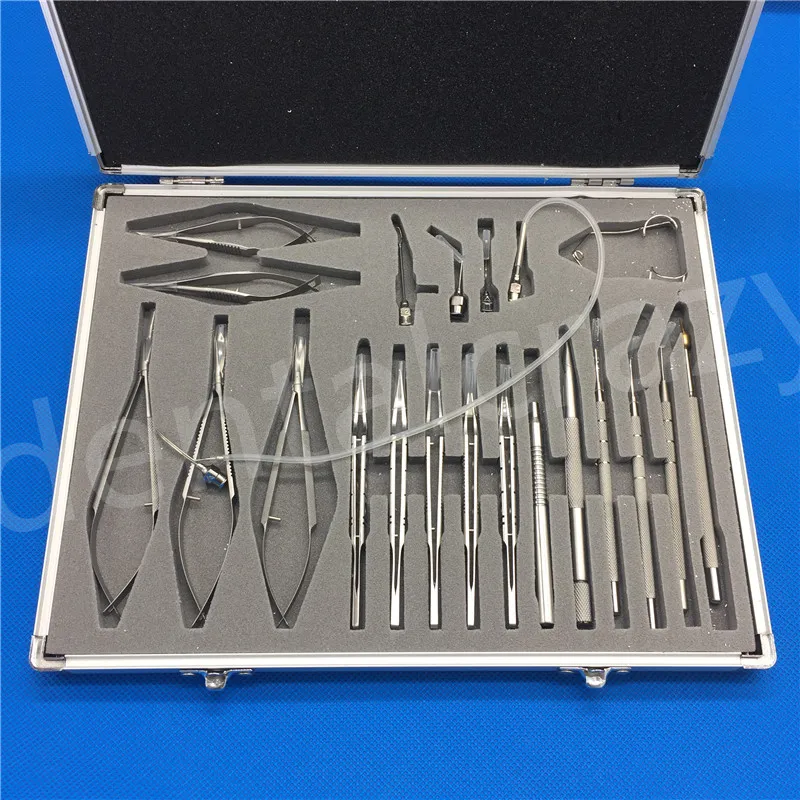 Описание: 1 ножницы для роговицы 2 катаракты ножницы память изогнутые наконечники 3 Микро-игольчатый держатель изогнутый Прямые Ножницы 4 Vannas Прямые изогнутые ножницы 5 ванн 6 спиральных щипцов роговицы прямые 7 пинцеты для капсулорексиса изогнутые, круглые наконечники 8 зажимных щипцов с коротким углом 9 зажимных щипцов прямые, платформа прямые 10 прямых зубчатых щипцов 11 держатель лезвия с пружиной 12 Настой наконечник катаракты с одной головкой конуса 13 Ирис Шпатель 14 наконечник в форме шара 15 IOL фиксационный крючок 16 IOL фиксация Крюк T тип Наконечник петли объектива 17 18 коаксиальный диафрагма I/A Cannula 0,3 мм 19 Posterior капсула полировщик короткий угловой 20 Ирис Шпатель Тип смыва 21 спектральная проволока для глаз