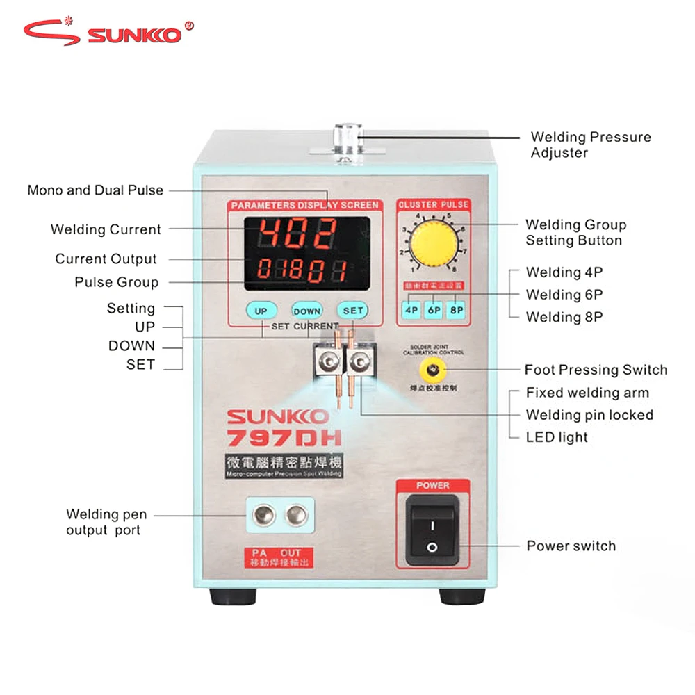SUNKKO 797DH точечный сварщик 3.8KW высокая мощность аккумуляторная машина для точечной сварки для 18650 аккумуляторных упаковок сварочные прецизионные импульсные точечные сварочные аппараты