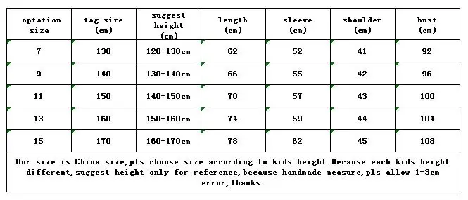 Примечание: 1. Поскольку рост детей одного и того же возраста отличается, пожалуйста, выберите размер, соответствующий росту. Рекомендуемый рост указан только для справки. 2. Пожалуйста, сравните с таблицей размеров, «Размер оптации»-это только приблизительный возраст, размер бирки-китайский Размер (см). 3. Если у вас есть путаница, пожалуйста, свяжитесь с нами. 4. Пожалуйста, примите во внимание возможную погрешность в 1-2 см, 1 дюйм = 2,54 см, 1 см = 0,39 дюймов.