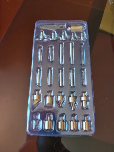 Работает очень хорошо! Тепловая мин. 180 C, макс. 480 C. Очень быстро нагревается. Часть, где вы носите палец, становится теплой, не горячей, возможно, после использования более 10 минут, но еще не пробовал. Доставка в Нидерланды в течение 1 месяца. Не уверены, что такое 5 черных наконечников...?