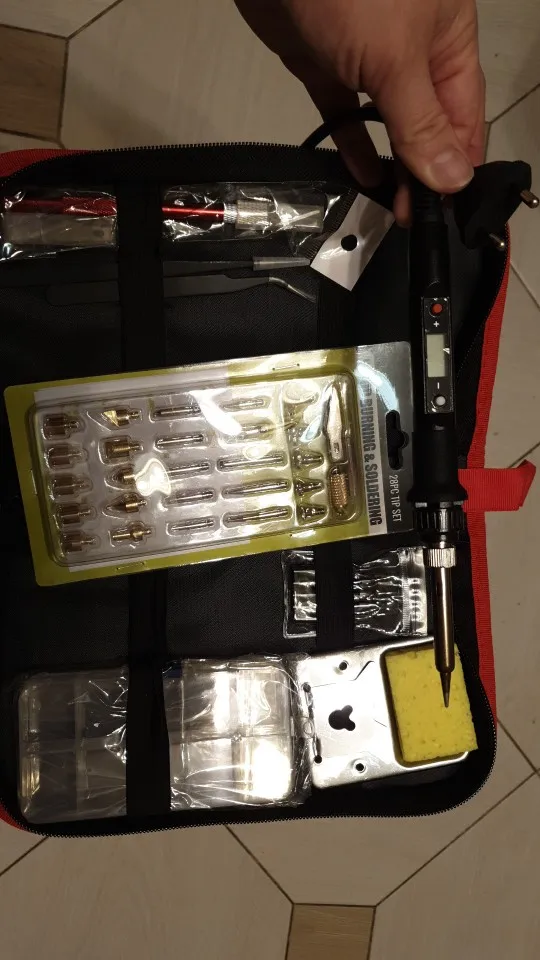 Продавец отправил заказ не полностью, я выбрал полный набор мне отправили набор без сумки и скальпеля, деньги возвращал через диспут. Мощность в процессе нагрева 70 Вт, в процессе поддержания температуры 60 Вт. Насадка для выжигания имеет внутренний диаметр сильно больше внешнего диаметра нагревательного элемента, насадки для выжигания начинают работать только при выставлении максимальной температуры :(.