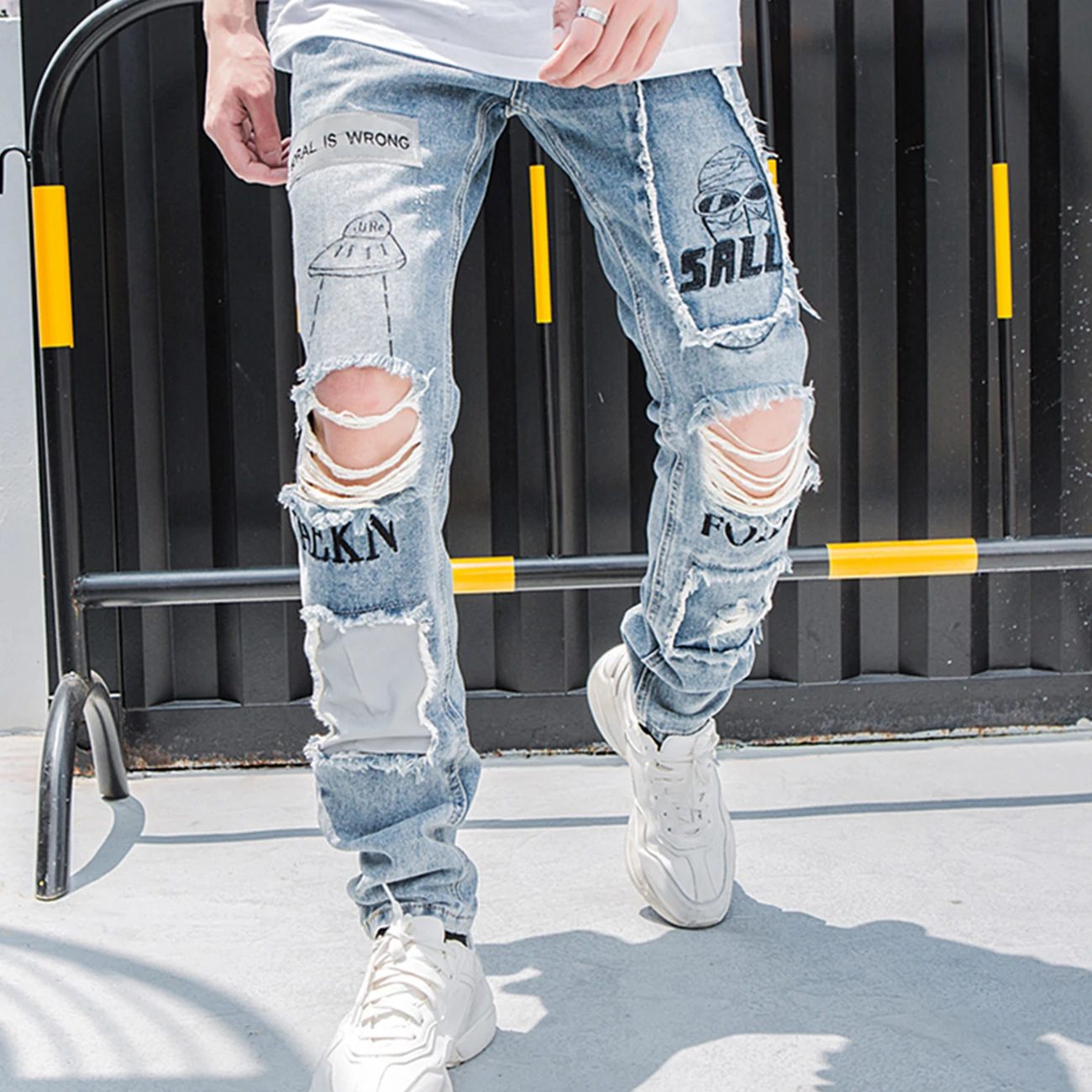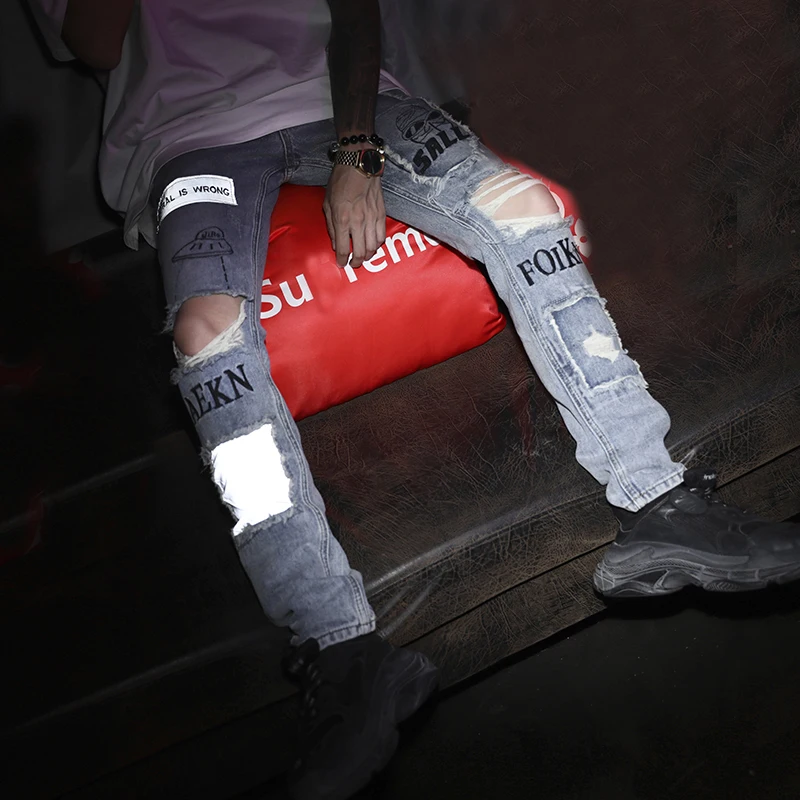 LACIBLE Светоотражающие Для мужчин хип-хоп джинсы скинни рваные Винтаж велосипедист бегун Проблемные отверстий, Широкие джинсовые Slim Fit Повседневное брюки