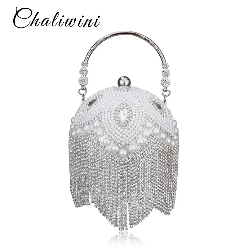 Женская сумочка с кисточками и жемчужными бусинами, круглая, свадебная, вечерняя сумочка, клатч, сумочка