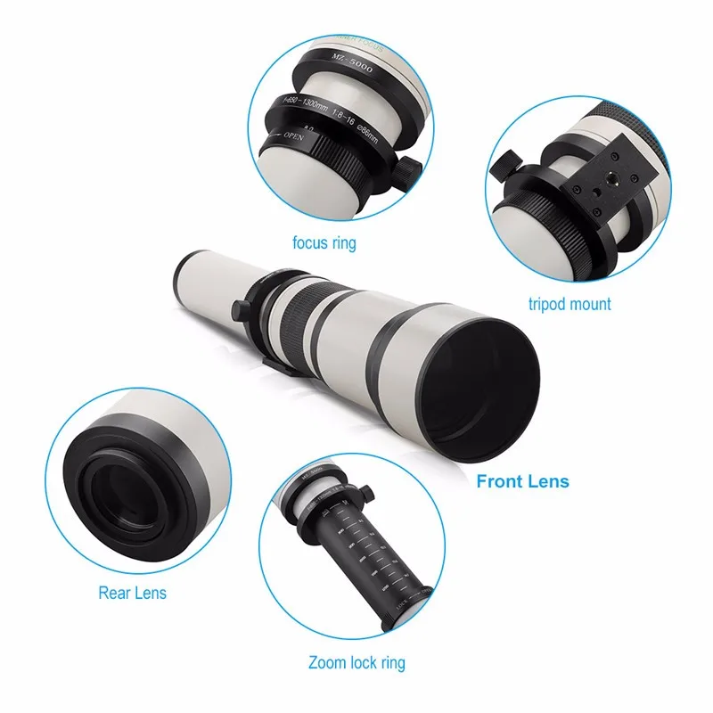 Объектив 650-1300 мм F8.0-16 Super Telephoto ручной зум + адаптер T2 для DSLR, Canon, Nikon, Pentax, Olympus M43, Sony A6300, A7, A7R II, GH5