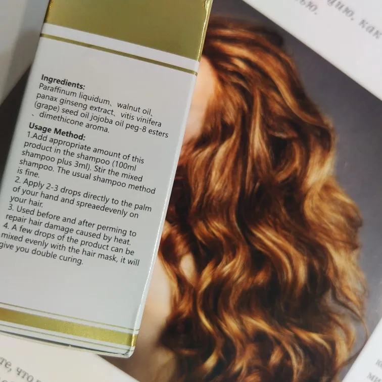 Эфирное масло для укрепления и питания волос. Эфирное масло для волос особенности продукта: Богатый разнообразными растительными цветами эссенция масла. Способствует росту волос, углубляет волосяные фолликулы, увлажняет и питает волосы. Богат женьшенем, укрепляет волосы, способствует росту. Доставка около трех недель почтой России. Упаковка фирменная коробка и почтовая коробочка. Метод использования: 1. Добавьте соответствующее количество этого продукта в шампунь (100 мл шампунь плюс 3 мл). Смешанный шампуны. Как обычно, можно использовать шампунь. 2. Можно непосредственно капать 2-3 мл в ладони, равномерно наносить на волосы. 3. Используется до и после химической завивки для восстановления повреждения волос, вызванного нагревом. 4. Несколько капель продукта могут быть равномерно смешаны с маской для волос. Хорошее маслице, я добавляю несколько капель в шампунь, нравится.