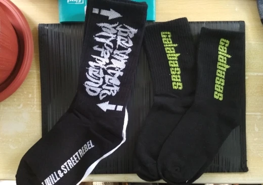 йоу! носки просто пушечные. принт нанесен хорошо. резинка тянется отлично. пришли за 2 месяца, с продавцом не говорил. товар не отслеживался. запах кислотный конечно, нужно стирать перед использованием. хороший товар, рекомендую. покупал вместе с купоном.