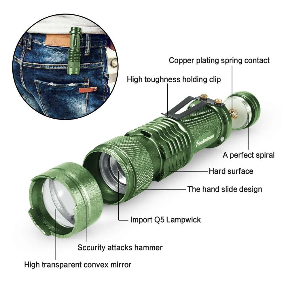 Супер Мини размер, яркий, ослепляющий эффект.Противоскользящий дизайн и водонепроницаемый дизайн.Регулируемый диапазон фокусировки для различного использования, растягивается для регулировки фокуса.Зажим для удобной переноски.Рабочее напряжение широкое и может использовать батареи в самой большой степени.Подходит для: кемпинга, пеших прогулок, велоспорта, альпинизма, охоты, рыбалки, авто чрезвычайных ситуаций, ремонта дома, семьи и активного отдыха и т. д.
