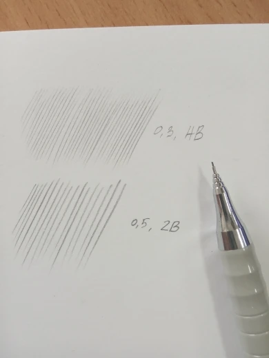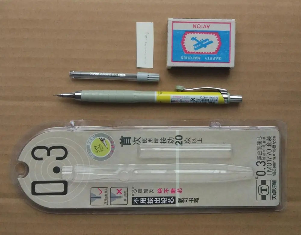 Хороший карандаш. Все хромированные детали металлические. Качество сборки довольно хорошее. Свинец в его трубке не болтается и не наклоняется при написании. Механизм нажатия приятный на ощупь. По сравнению 0,3-0,5-они не сильно отличаются. Форма наконечника свинца может сделать 0,3 свинца более толстой леской, чем свежевращающаяся долото-точка 0,5 свинца. Но в среднем будет небольшой шаг к тонким линиям, которые мне нравятся.