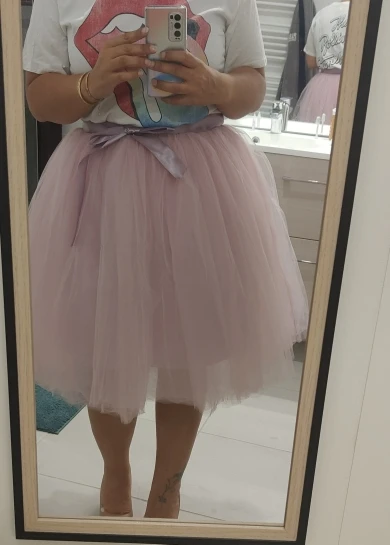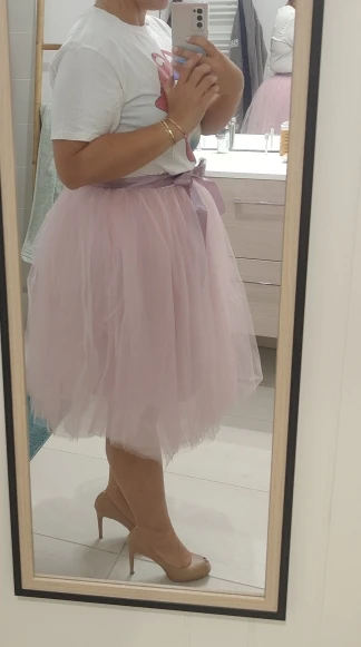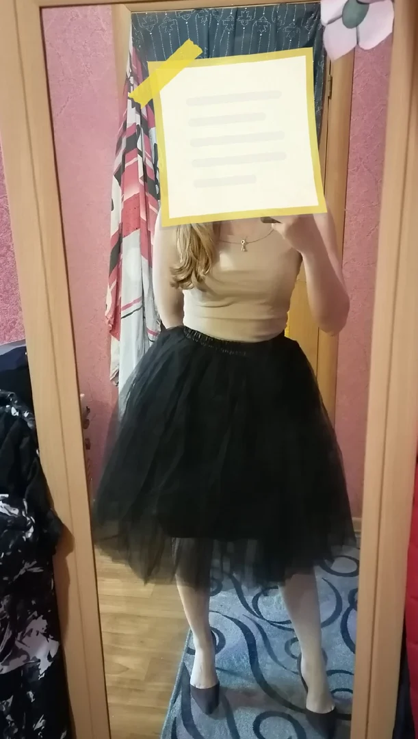Юбка пришла быстро. Сшита вполне нормально, 6 слоев фатина, 1 слой подклад. Смотрится пышно. На мой рост 169 по длине села чуть ниже колена. Единственное, хотелось бы туже резинку (талия примерно 63). Думаю, если талия меньше, будет немного болтаться. За свои деньги очень достойный товар.