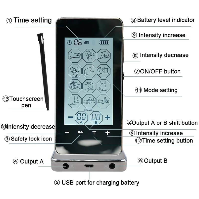 • Помогает облегчить незначительные Нервные и мышечные боли и боли. Он состоит из двух основных компонентов, а именно, трансъкожного электронного нервного стимулятора и электронного мышечного стимулятора/мышечного стимулятора, который генерирует необходимые сигналы стимуляции, и 2 набора проводов с электродными прокладками.