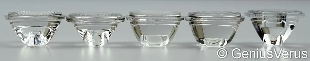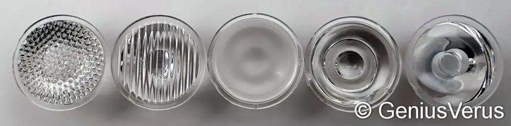 Линзы имеют разную высоту и простую геометрию (более продвинутые линзы справа на фотографиях #1-2-от фонарика на фото #3). Лучи: глянцевые линзы дают точный круглый луч и не имеют настоящего широкого ближнего света; глянцевые линзы 30-60 ° и линзы в полоску <45 ° дают много вспышек и показывают квадрат и ножки светодиодов; Глянцевые линзы 90-120 ° дают плохой кольцевой луч; линзы в полоску обеспечивают прямоугольный свет, который не удобен для ходьбы (Возможно, подойдет для bikecycling); Все матовые и Коллиматорные линзы имеют Гладкий Круглый луч; Коллиматорные линзы дают самую однородную широкую область света, поэтому они требуют очень ярких мощных светодиодов. Лучший набор из 2 светодиодов и линз 15 ° глянцевый объектив для дальнего света + 30-45 ° коллиматор или 60-90 ° Матовый объектив для широкоугольного освещения. Один из лучших универсальных линз 15-45 ° коллиматор или 30-60 ° Матовый объектив. Некоторые глянцевые имеют скобы. Некоторые из приобретенных различных линз поставляются идентичными. Более подробная информация скоро в базе данных GeniusVerus light.