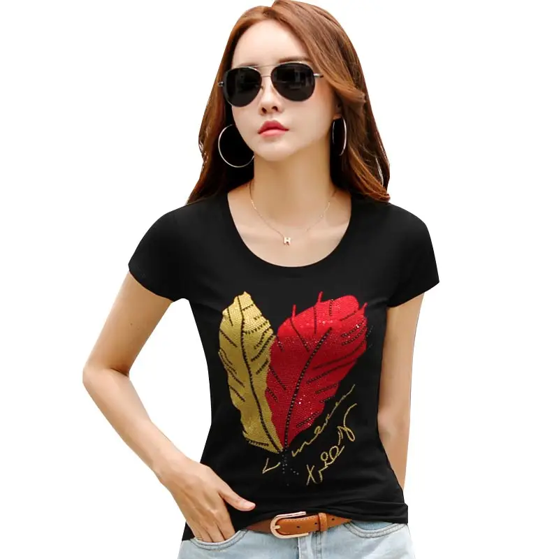 Женская хлопковая Футболка с круглым вырезом, черная или белая Повседневная футболка с цветочным принтом и бисером, 2018