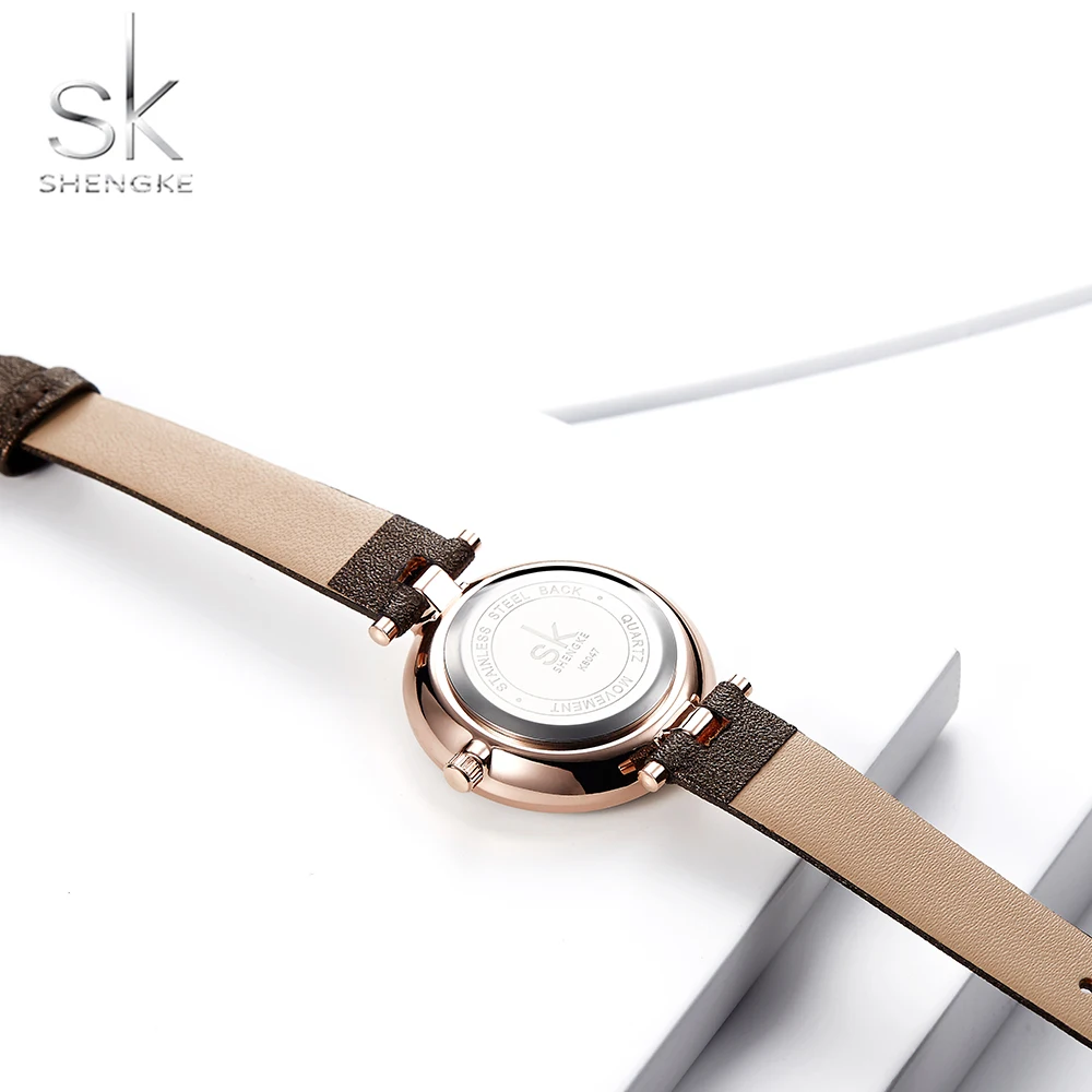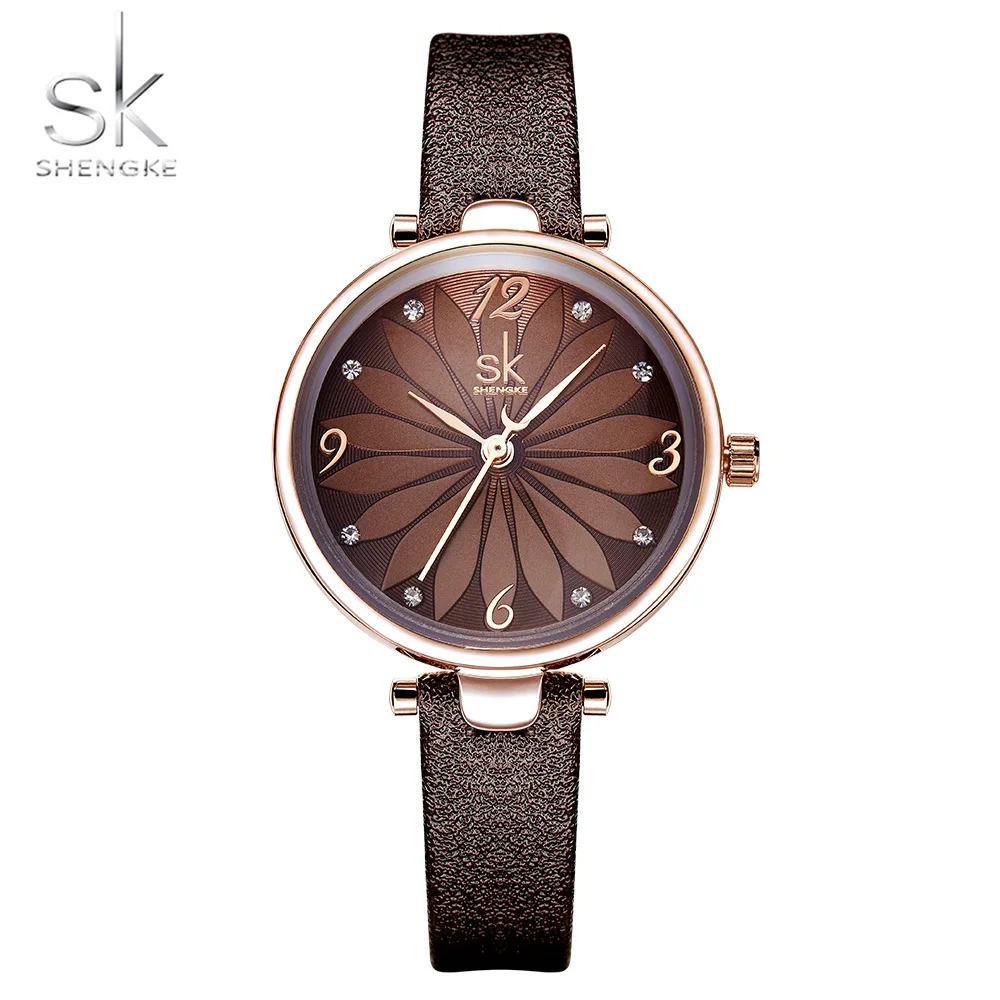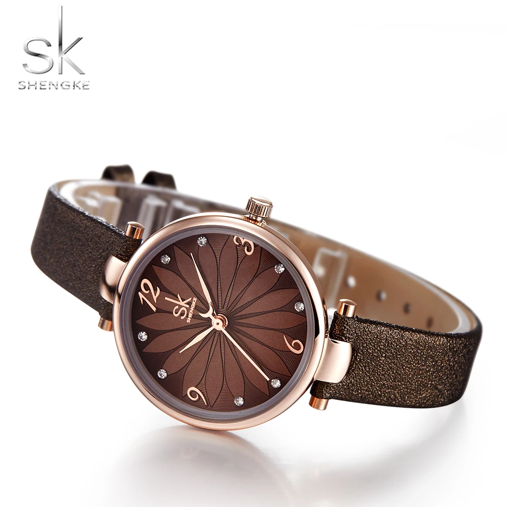 Часы Shengke женские кварцевые, аналоговые повседневные, с кожаным ремешком, с цветочным циферблатом