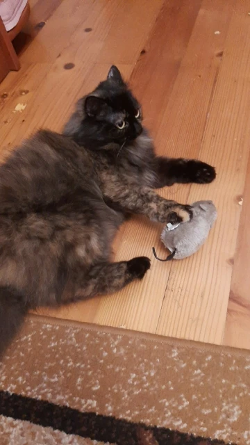 Мышка пришла чёрная. Кот играет вроде, даже как просто игрушкой. Заказчик доволен)